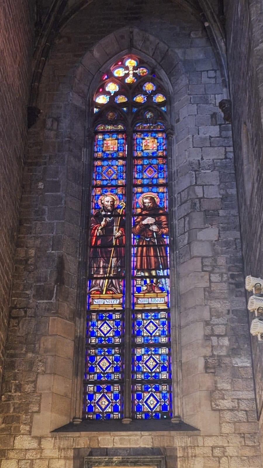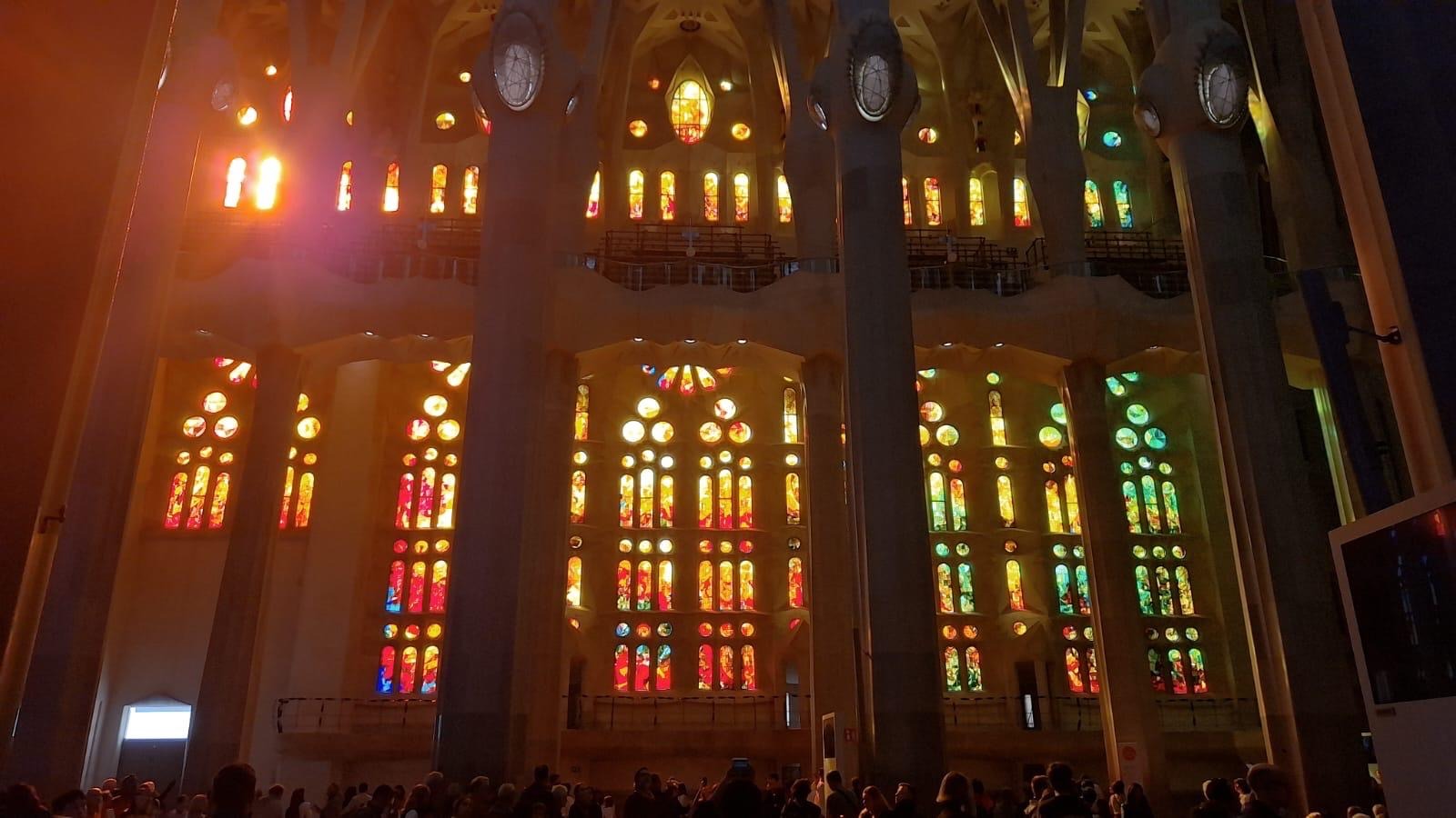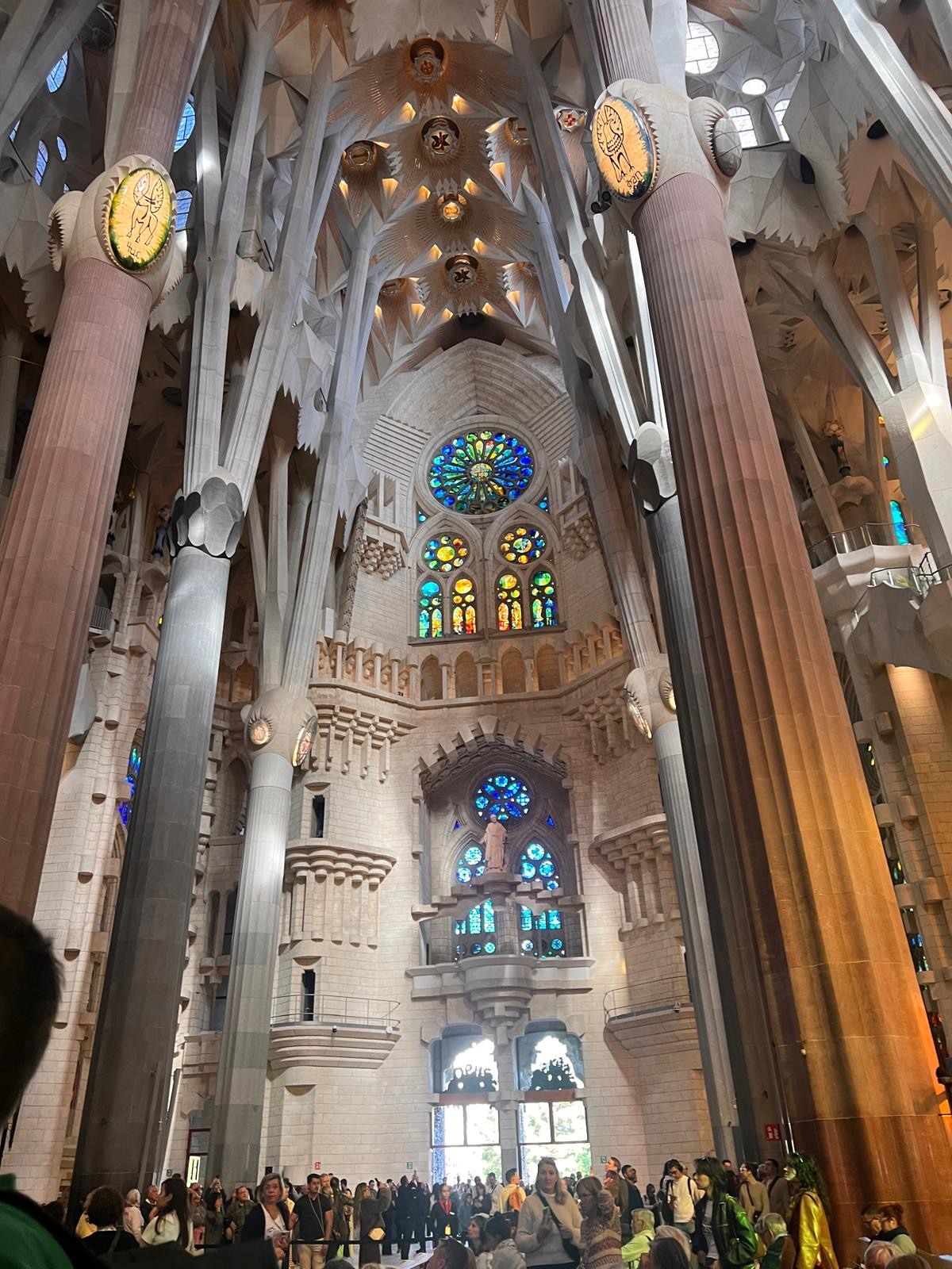 Der erste Eindruck war: ¡Qué maravilloso! Die einzigartige Architektur von Antoni Gaudí war überwältigend! Jeder Stein schien genau durchdacht und hatte seine Bedeutung, wie wir später in einer geführten Tour erfuhren. Es ist kaum in Worte zu fassen, was wir alles gesehen haben. Wir haben einfach jeden Moment aufgesogen und genossen. Aber um euch einen kleinen Einblick zu geben: wir sahen das Licht durch die bunten Fenster tanzen, betrachteten und suchten mit Quizaufgaben die kleinsten Details, egal ob Blätter, Tiere, Menschen oder scheinbar „normale“ Steine die genau von Gaudí gewählt worden sind.