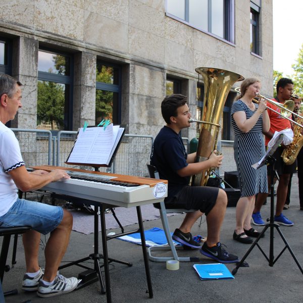 Zur Begrüßung gab es Sekt, auf dem Schulhof boten Schülerinnen und Schüler der Oberstufe Kaffee, Kuchen und Käsehäppchen mit Weißbrot an, und die Jazzband von Hilmar Stemmler spielte.