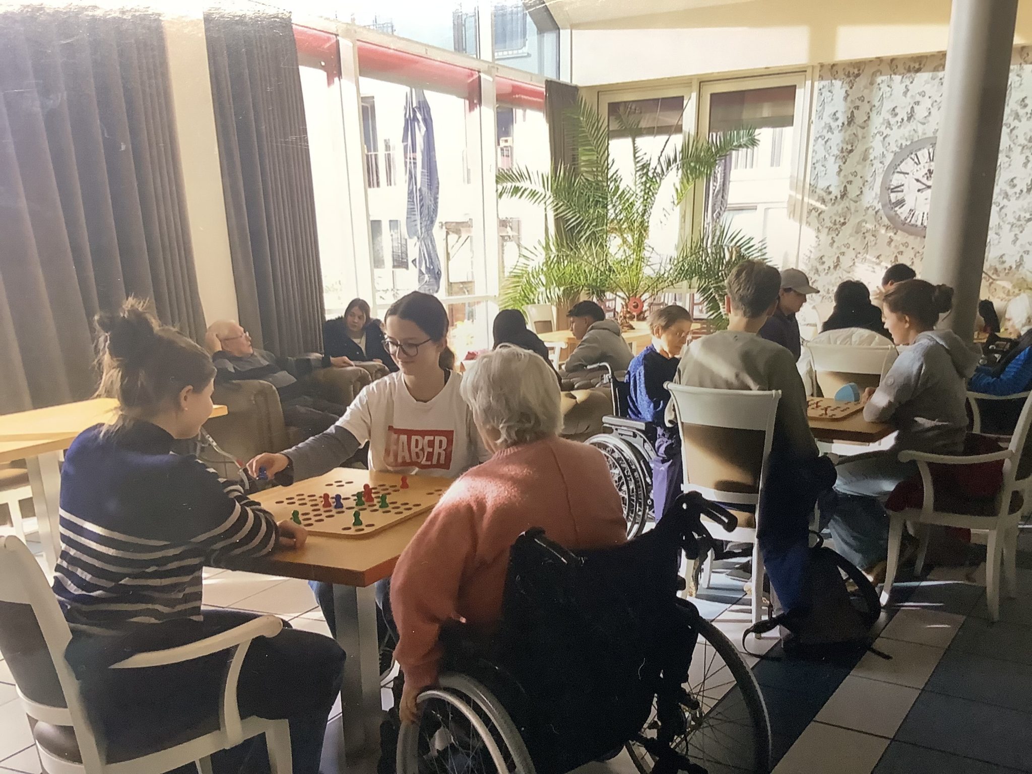 In den Monaten von August bis November 2025 besuchten wir – der Religionskurs der neunten Klassen von Frau Werner – das Seniorenheim „Luisenhof“ und absolvierte dort ein Praktikum. Vorher übten wir bei ORT, wie man Menschen im Rollstuhl richtig begleitet. Durch Sensibilisierungsübungen erfuhren wir, was Menschen mit Einschränkungen brauchen. So waren wir gut auf die Aktivitäten mit den Senioren vorbereitet. Wir haben Kartoffelmarmelade gekocht, Engel gebastelt, sind spazieren gegangen, haben Brett-, Karten- und Wiispiele gespielt und haben an der Bewegungsrunde teilgenommen. Das Praktikum lieferte uns einen kleinen Einblick in den Alltag der Menschen im Luisenhof und es war eine einzigartige Erfahrung, mit den Senioren ins Gespräch zu kommen. Wir bekamen anschaulich geschildert, wie sich der Alltag vor 50 Jahren gestaltete, wie sich Krieg und Verfolgung anfühlen und wie man aus Eicheln Kaffee kocht…..