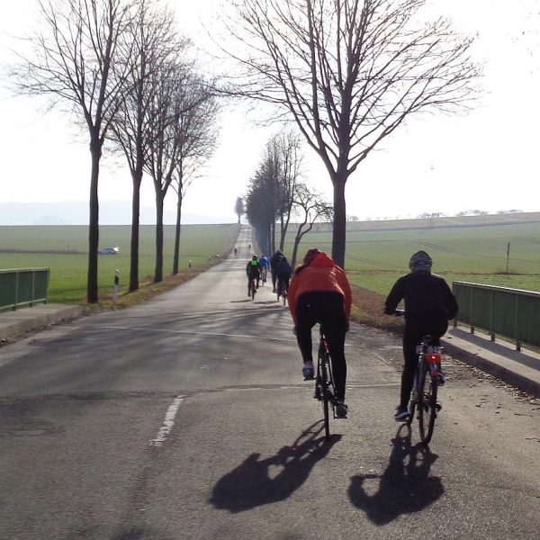 Langsam und in Einerreihe hintereinander haben wir uns auf dem Weg nach Rosdorf gefunden, Handzeichen und Abstand geübt, um ab da meist in Zweierreihe plaudernd nebeneinander weiterzufahren. Die Racer bogen in Tiefenbrunn wieder ab in die Berge, für uns war erst einmal die Zeit wichtig, denn viele hatten noch nie zwei Stunden im Sattel gesessen. Auf bekannten Wegen gegen die strahlende Sonne mit wenig Gegenwind ging es über Mengershausen, Lemshausen zur ersten echten Steigung des Tages nach Volkerode. Gut Trainierte flogen so früh im Jahr hier schon hoch, andere spürten, dass sie noch Training brauchen. Oben gewartet, ging es gemeinsam nach Dramfeld und hügelig über Klein Schneen nach Elkershausen und damit ein kurzes Stück auf der 100 km Strecke. Ein Schleichweg zwischen Marzhausen (in Hessen) nach Reckershausen brachte uns zur B27 und damit in den Rückenwind, der uns bis Göttingen begleitete – wie das Lächeln über den Tag! Nach gut zwei Stunden waren wir zurück und hatten mit gut 40 km schon fast die Distanz der „kleinen Runde“ geschafft, läuft! Jetzt fehlen noch die längeren Steigungen, Feinschliffe am Material und Übung mit den Klickpedalen 😉