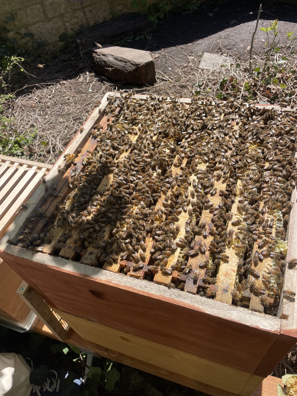 Heute haben wir auch beim zweiten Volk einen Honigraum aufgesetzt. Der Grund: Unsere fleißigen Immen haben inzwischen 9 von 10 Rähmchen mit Brut belegt – ein klares Zeichen, dass es Zeit ist, ihnen mehr Platz zum Sammeln und Einlagern zu geben.