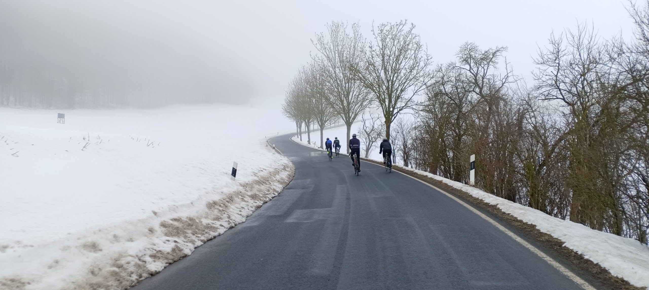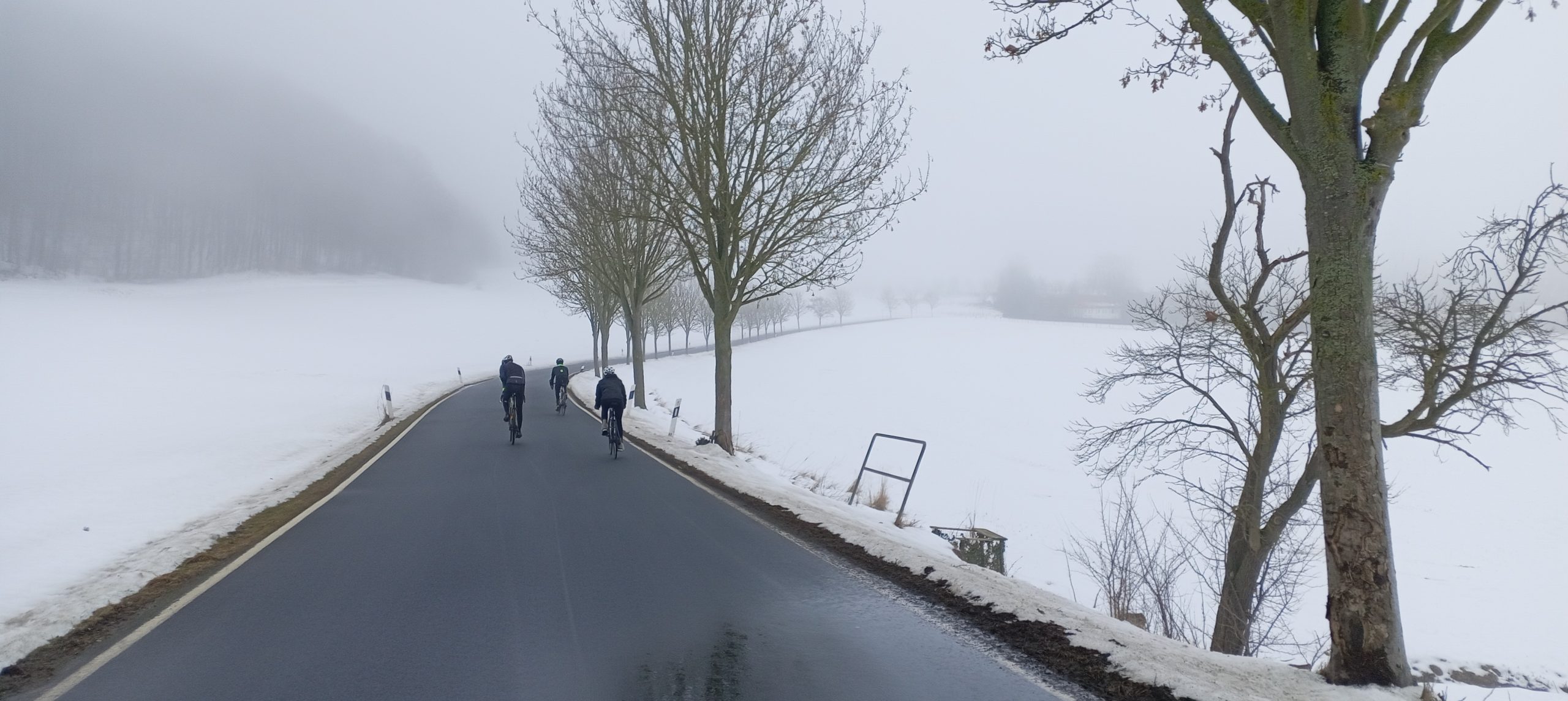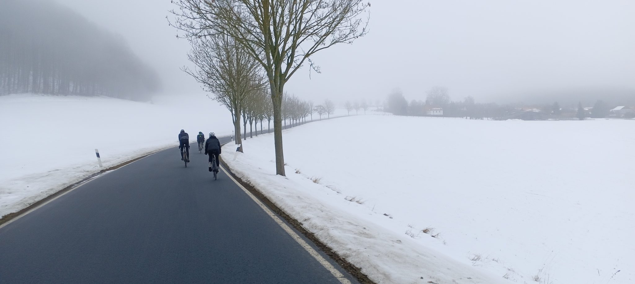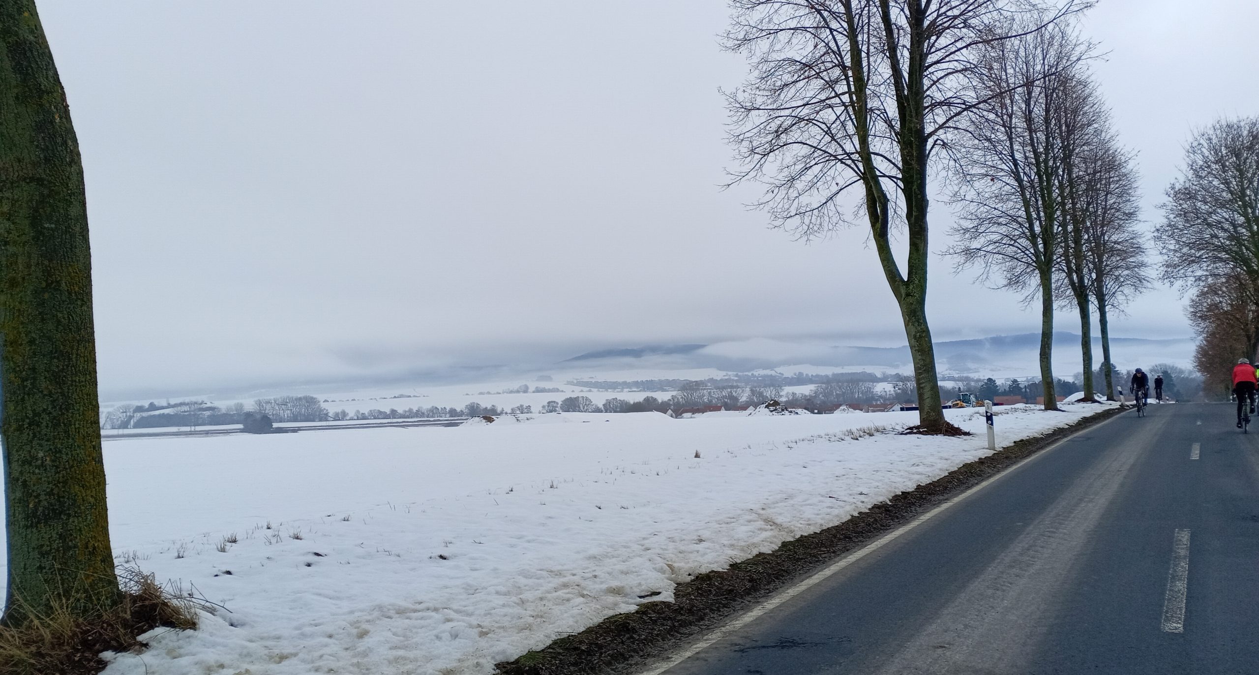 Denkste Wendepunkt, nicht genug gefordert wollten alle die echte Bergwertung am Bocksbühl fahren (ü 100 Höhenmeter am Stück), also über Reifenhausen nach Lichtenhagen hoch und dann die lange Abfahrt nach klein Schneen zum Radweg an der B27. Kaum eingebogen zog der Nebel zu und das Feld je nach Trainingszustand weit auseinander. Mystische Bilder und Grinsen beim Abfahren inbegriffen. Der Rest war plaudernde Zweierreihe auf dem Radweg, die oft Wegen Gegenverkehr zur Einerreihe umgebaut werden musste. Ganz schön was los an diesem Sonntag, Vorboten des Frühlings?