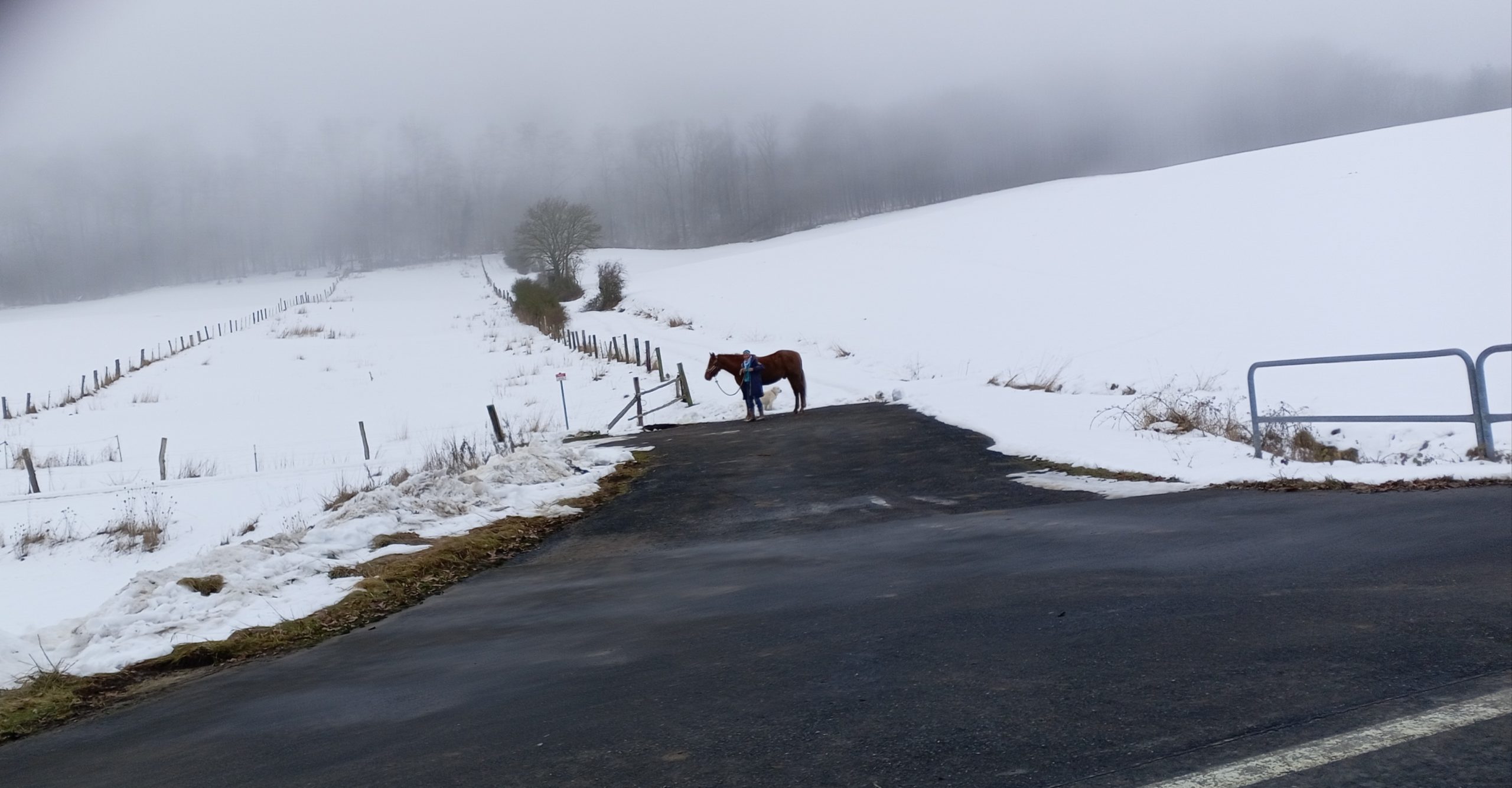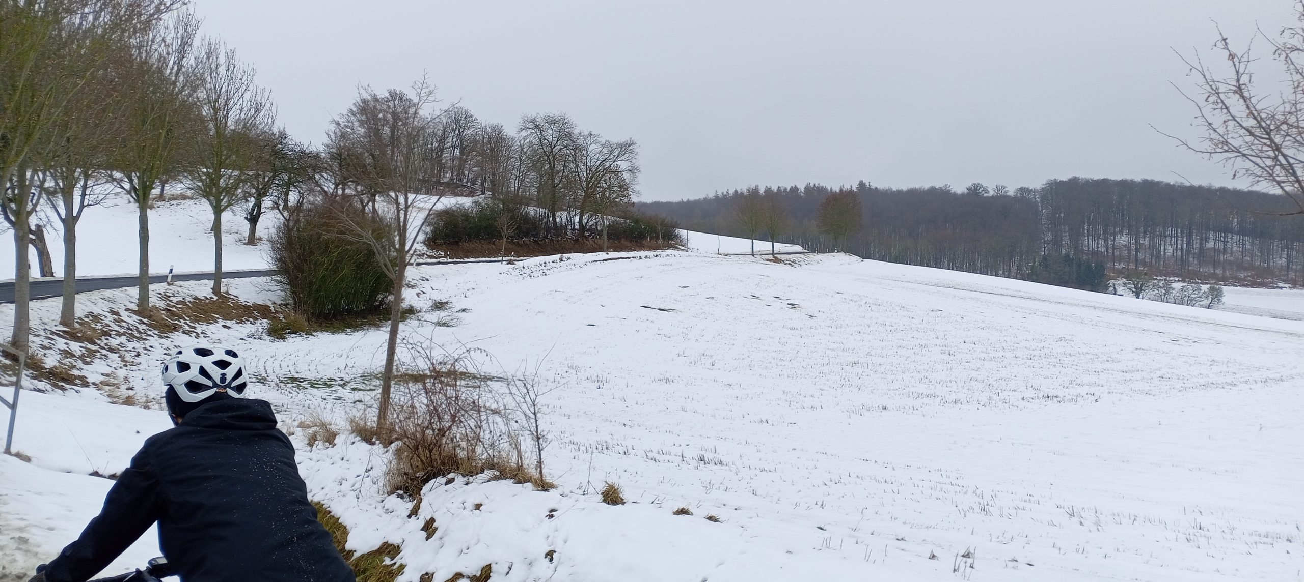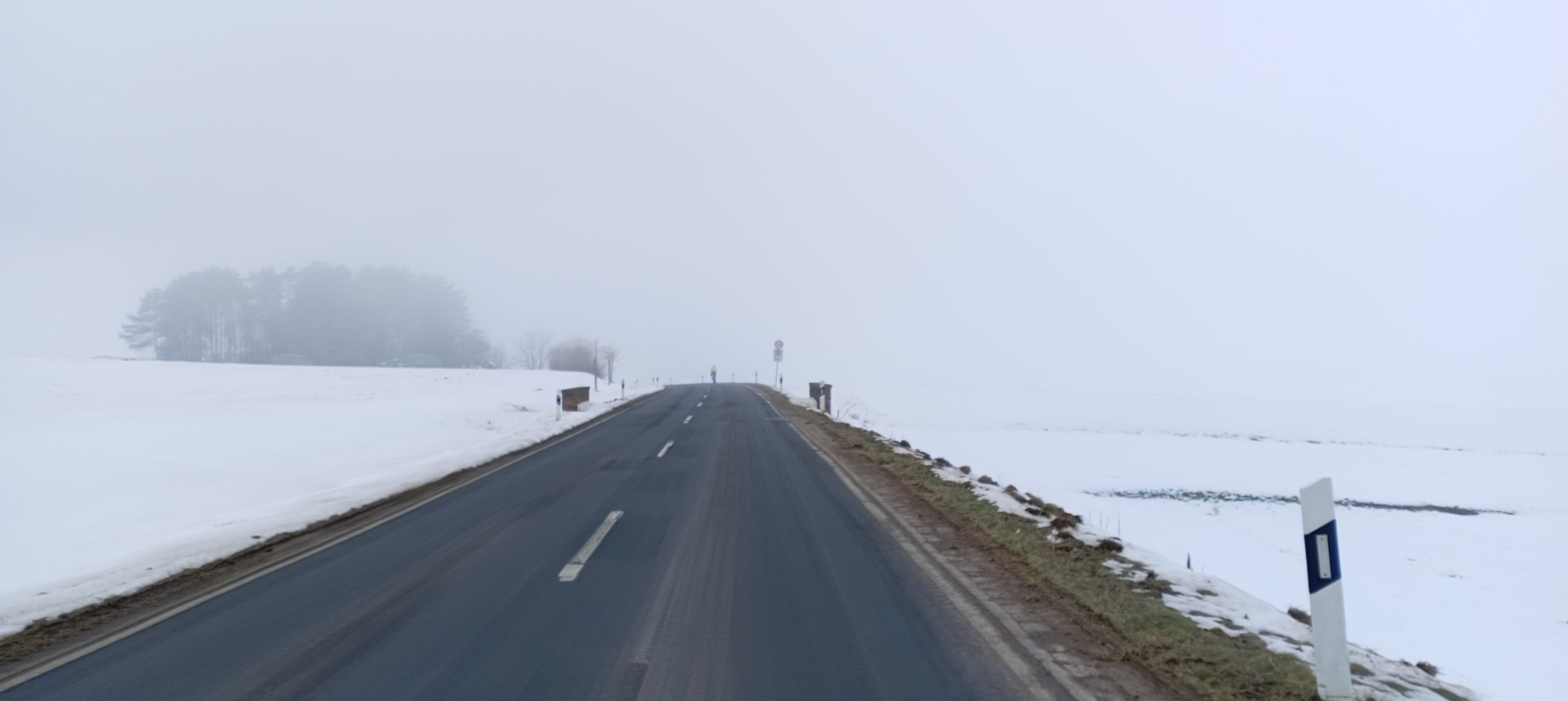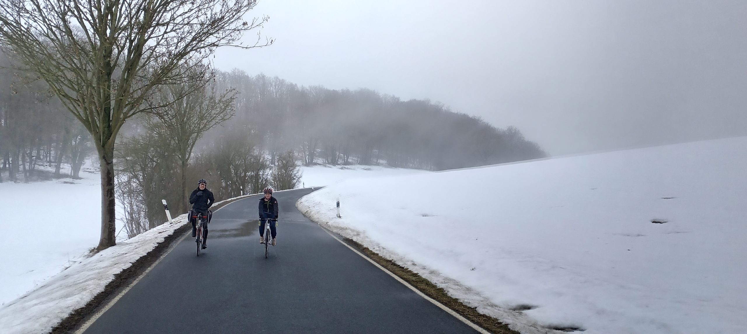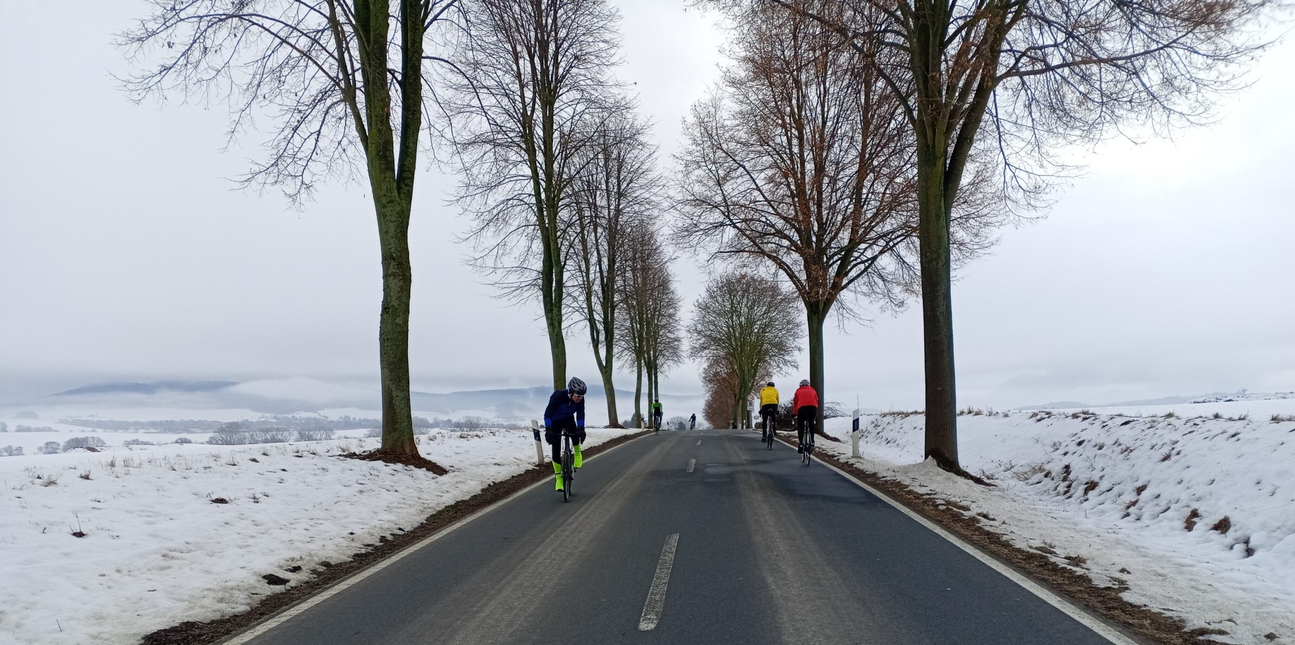 Denkste Wendepunkt, nicht genug gefordert wollten alle die echte Bergwertung am Bocksbühl fahren (ü 100 Höhenmeter am Stück), also über Reifenhausen nach Lichtenhagen hoch und dann die lange Abfahrt nach klein Schneen zum Radweg an der B27. Kaum eingebogen zog der Nebel zu und das Feld je nach Trainingszustand weit auseinander. Mystische Bilder und Grinsen beim Abfahren inbegriffen. Der Rest war plaudernde Zweierreihe auf dem Radweg, die oft Wegen Gegenverkehr zur Einerreihe umgebaut werden musste. Ganz schön was los an diesem Sonntag, Vorboten des Frühlings?