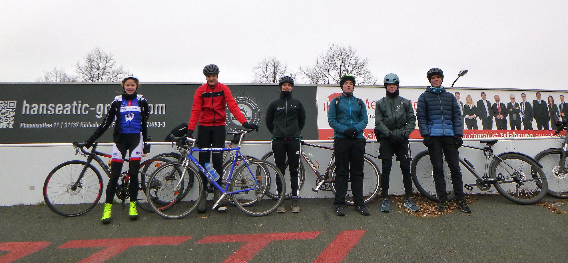 Vorbei an stehenden Zügen und Obernjesa gab es das gewünschte Plaudern und Lächeln auf dem windunterstützten Rückweg. Hier gab der schmale, gut frequentierte Radweg genug Gelegenheit, die Gruppenzeichen zu üben und von Zweier- auf Einerreihe und wieder zurück zu wechseln, wenn Gegenverkehr kam. Mittlerweile wurde das Schneetreiben dichter und mit jedem Meter in der Stadt haben sich Mittrainierende verabschiedet. Die Trainingsbegleitung endete auf den Feldwegen hinter Holtensen bei kaltem Regen – na und, einfach weggeplaudert!
