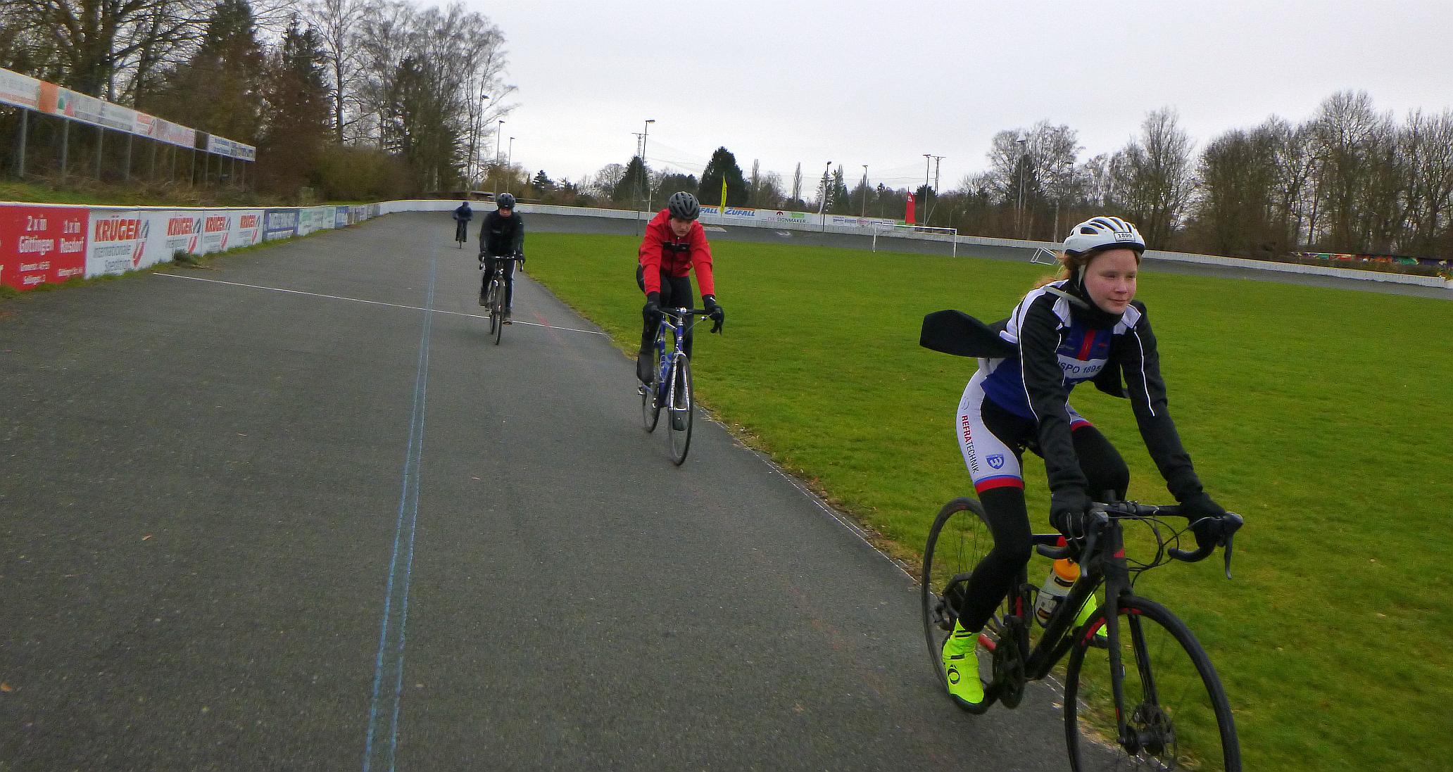 Beim Start war es kälter und der Wind schneidender als gestern, danke Tiefdruckgebiet mit dem seltsamen Doppelnamen. Doch der guten Laune beim Start konnte dies nichts anhaben. Unsere Abfahrt verzögerte sich, wir warteten noch auf einen Zuspätkommer und drehten zum Warmwerden ein paar Runden auf der Radbahn. Unser Rockie kam dann doch nicht, beide Räder platt, schade!
