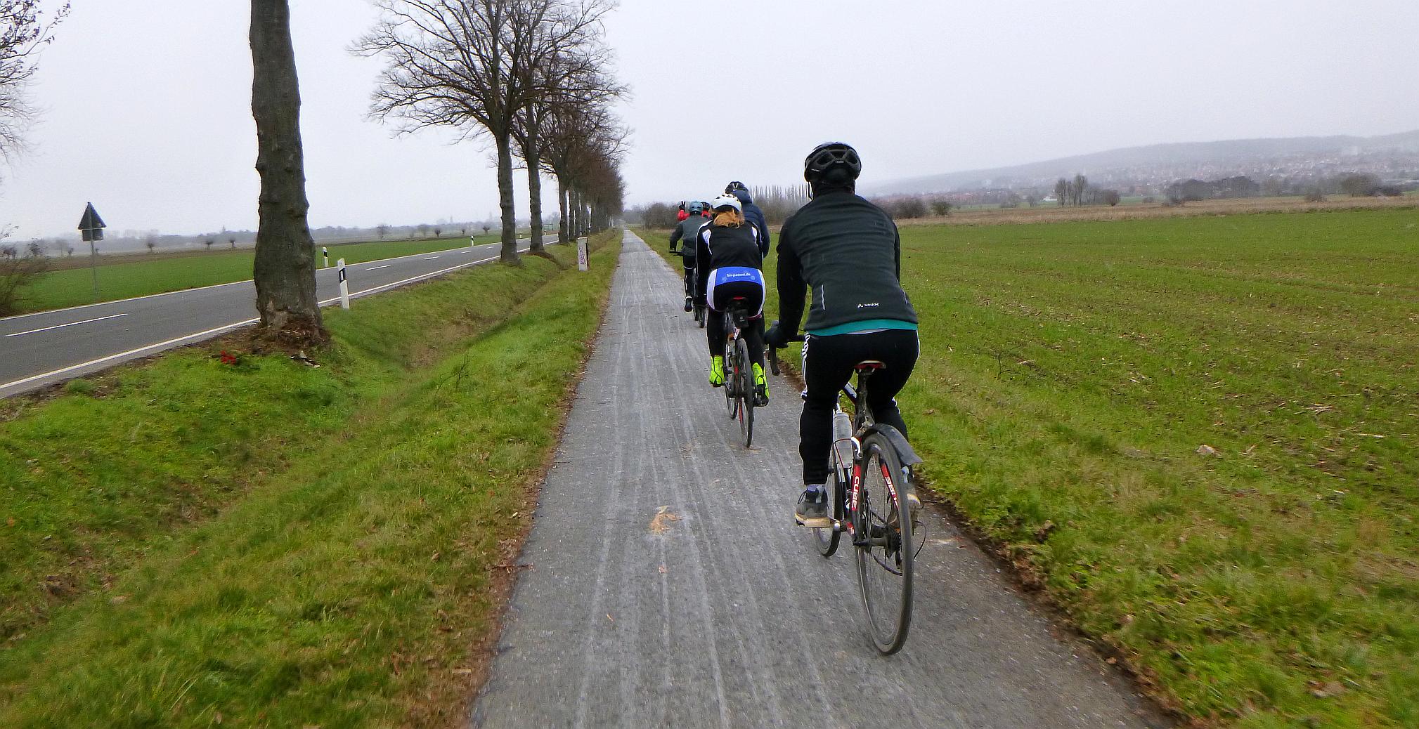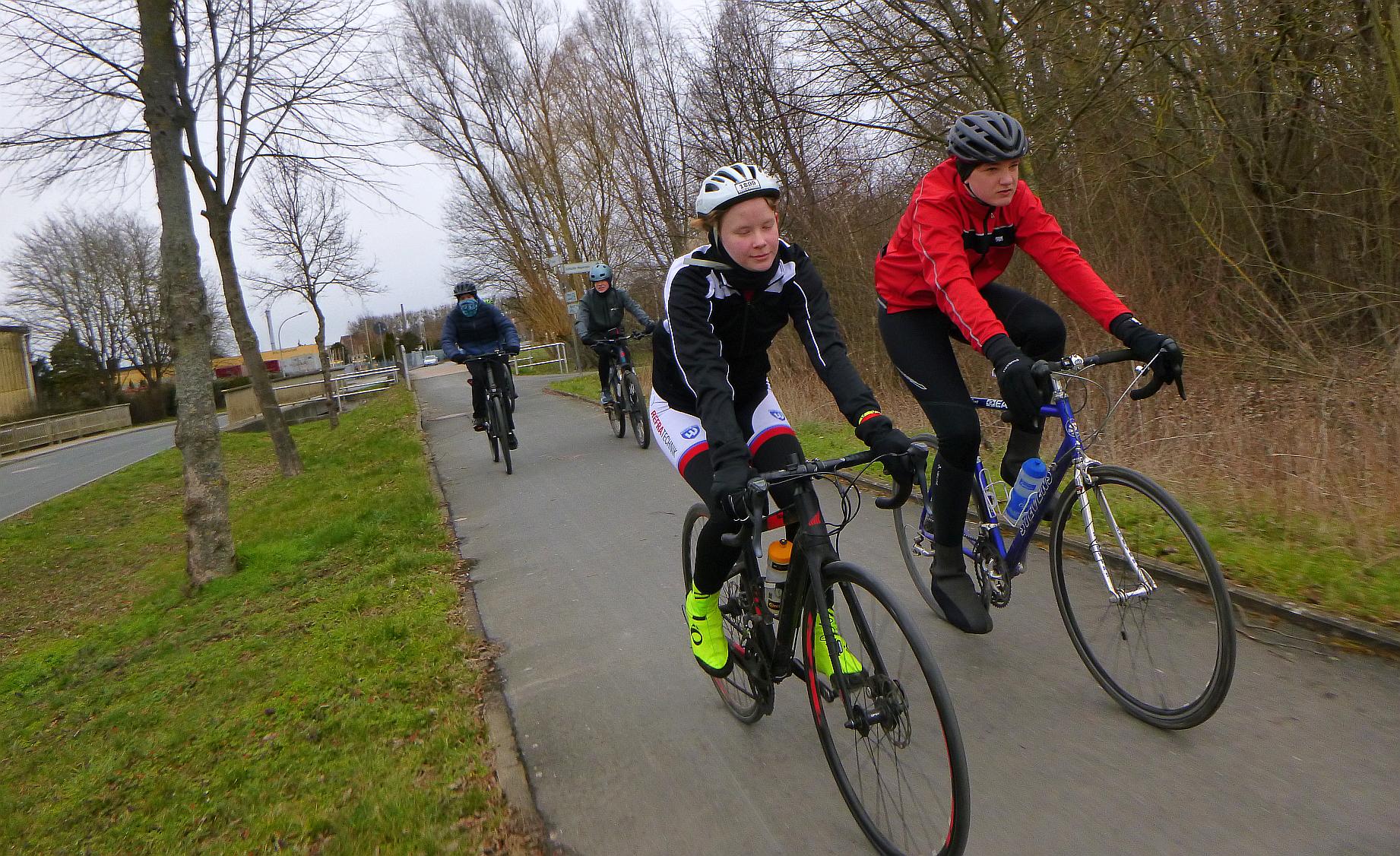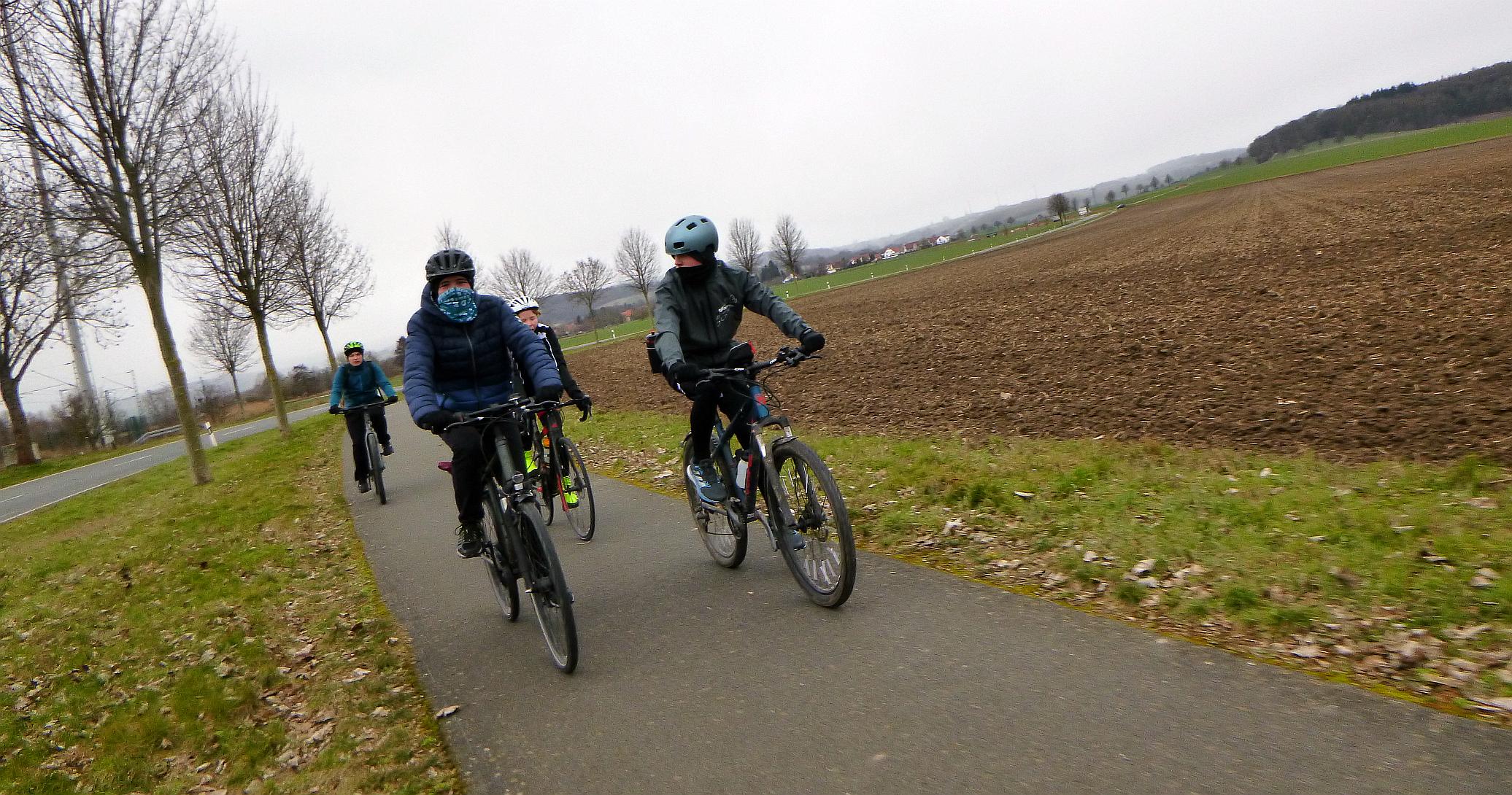 Vorbei an stehenden Zügen und Obernjesa gab es das gewünschte Plaudern und Lächeln auf dem windunterstützten Rückweg. Hier gab der schmale, gut frequentierte Radweg genug Gelegenheit, die Gruppenzeichen zu üben und von Zweier- auf Einerreihe und wieder zurück zu wechseln, wenn Gegenverkehr kam. Mittlerweile wurde das Schneetreiben dichter und mit jedem Meter in der Stadt haben sich Mittrainierende verabschiedet. Die Trainingsbegleitung endete auf den Feldwegen hinter Holtensen bei kaltem Regen – na und, einfach weggeplaudert!