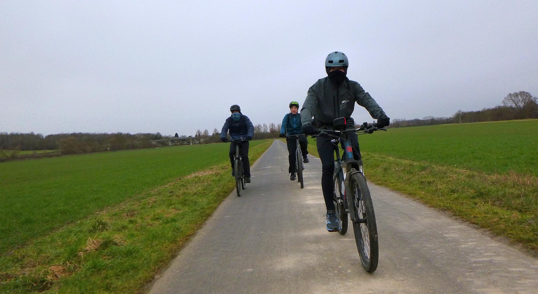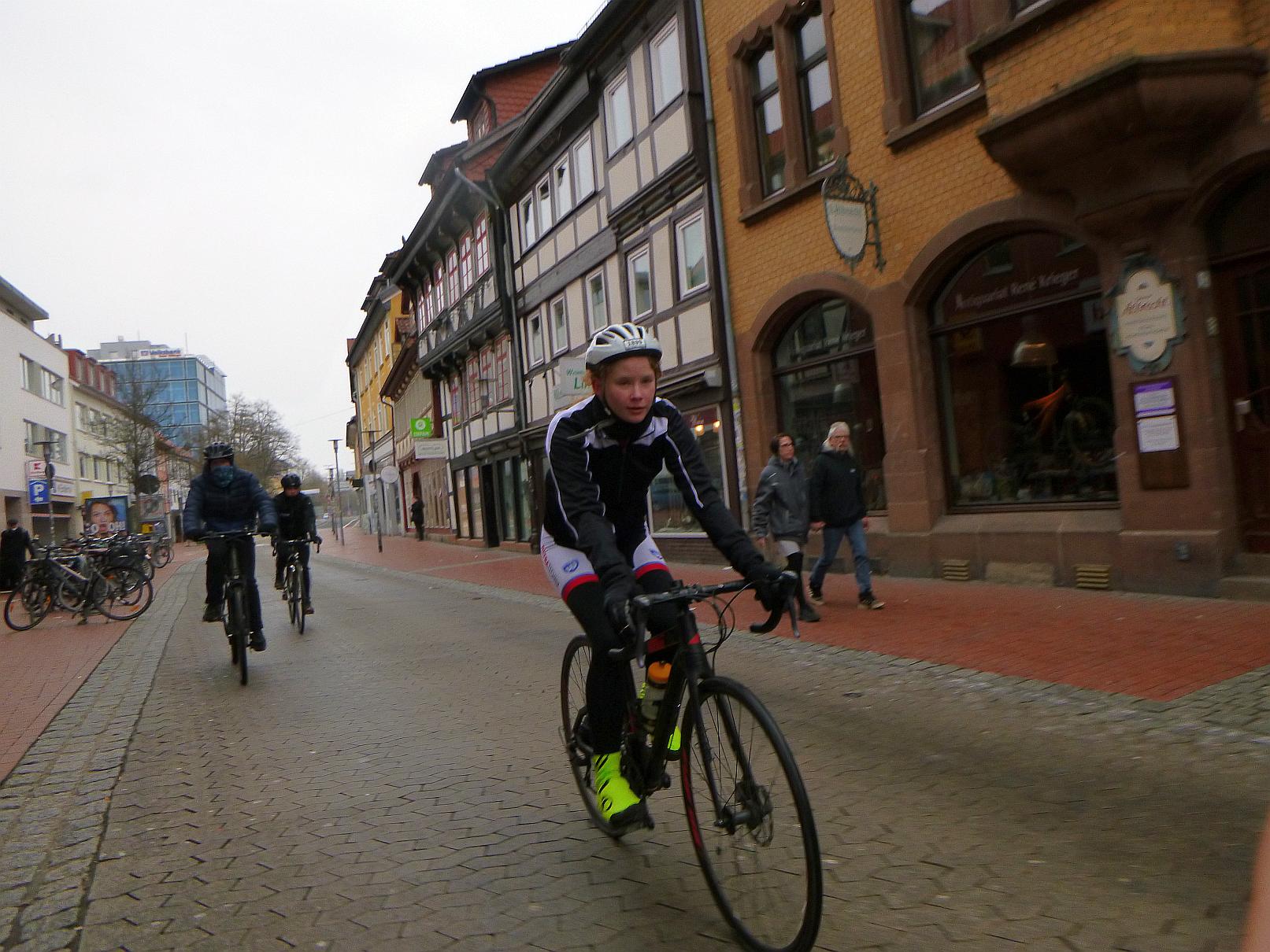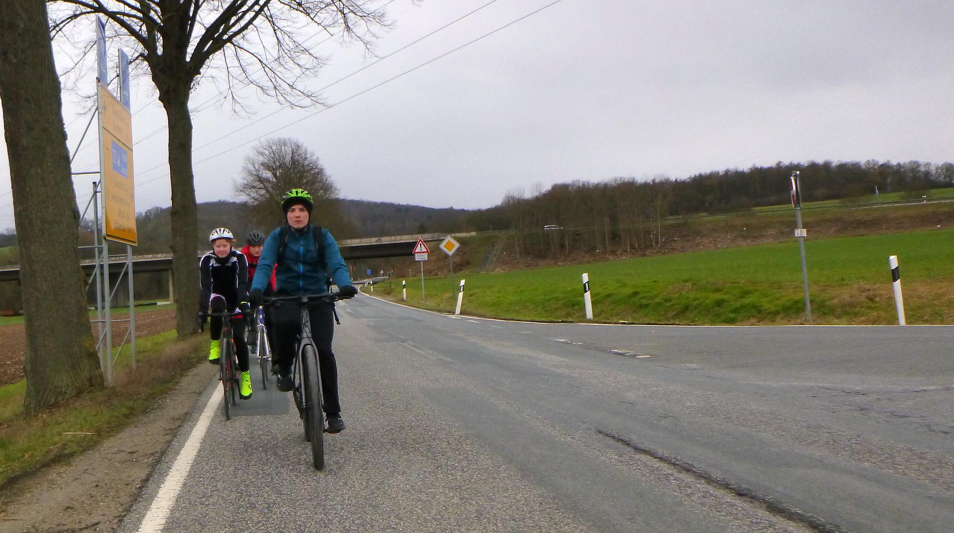 Vorbei an stehenden Zügen und Obernjesa gab es das gewünschte Plaudern und Lächeln auf dem windunterstützten Rückweg. Hier gab der schmale, gut frequentierte Radweg genug Gelegenheit, die Gruppenzeichen zu üben und von Zweier- auf Einerreihe und wieder zurück zu wechseln, wenn Gegenverkehr kam. Mittlerweile wurde das Schneetreiben dichter und mit jedem Meter in der Stadt haben sich Mittrainierende verabschiedet. Die Trainingsbegleitung endete auf den Feldwegen hinter Holtensen bei kaltem Regen – na und, einfach weggeplaudert!