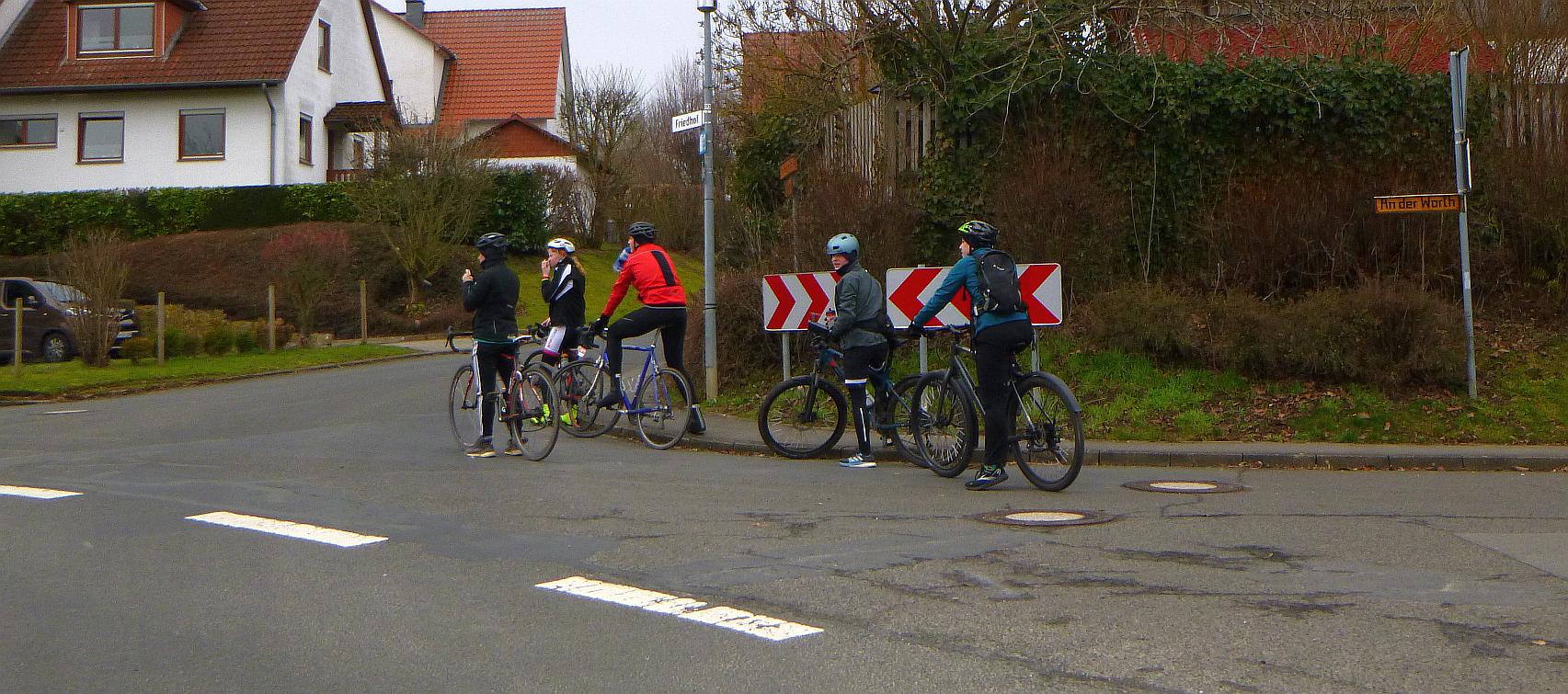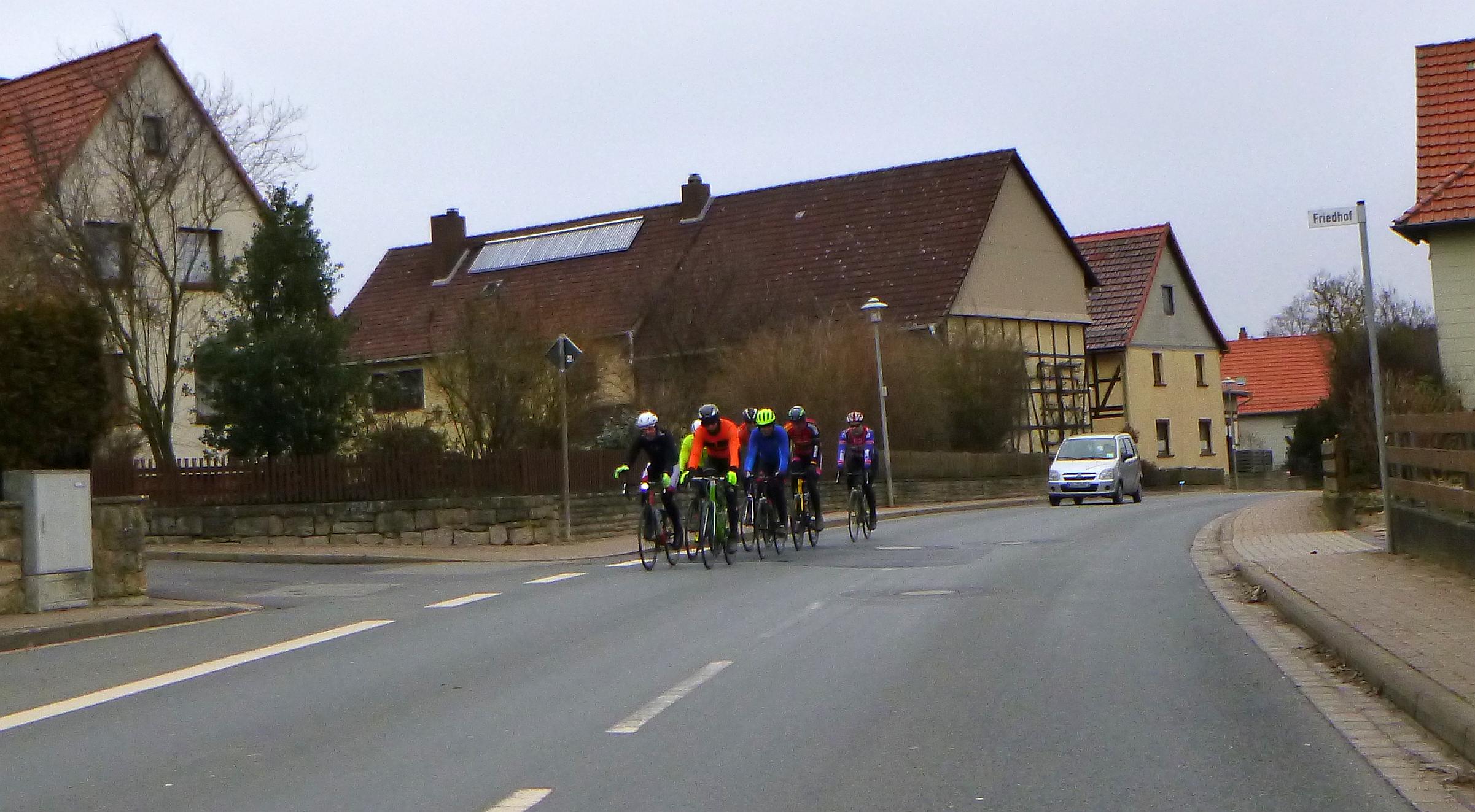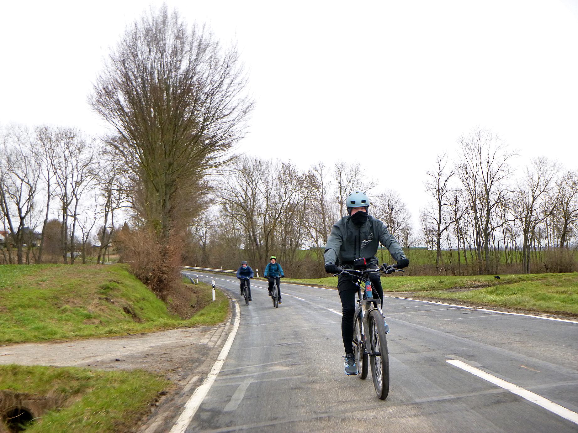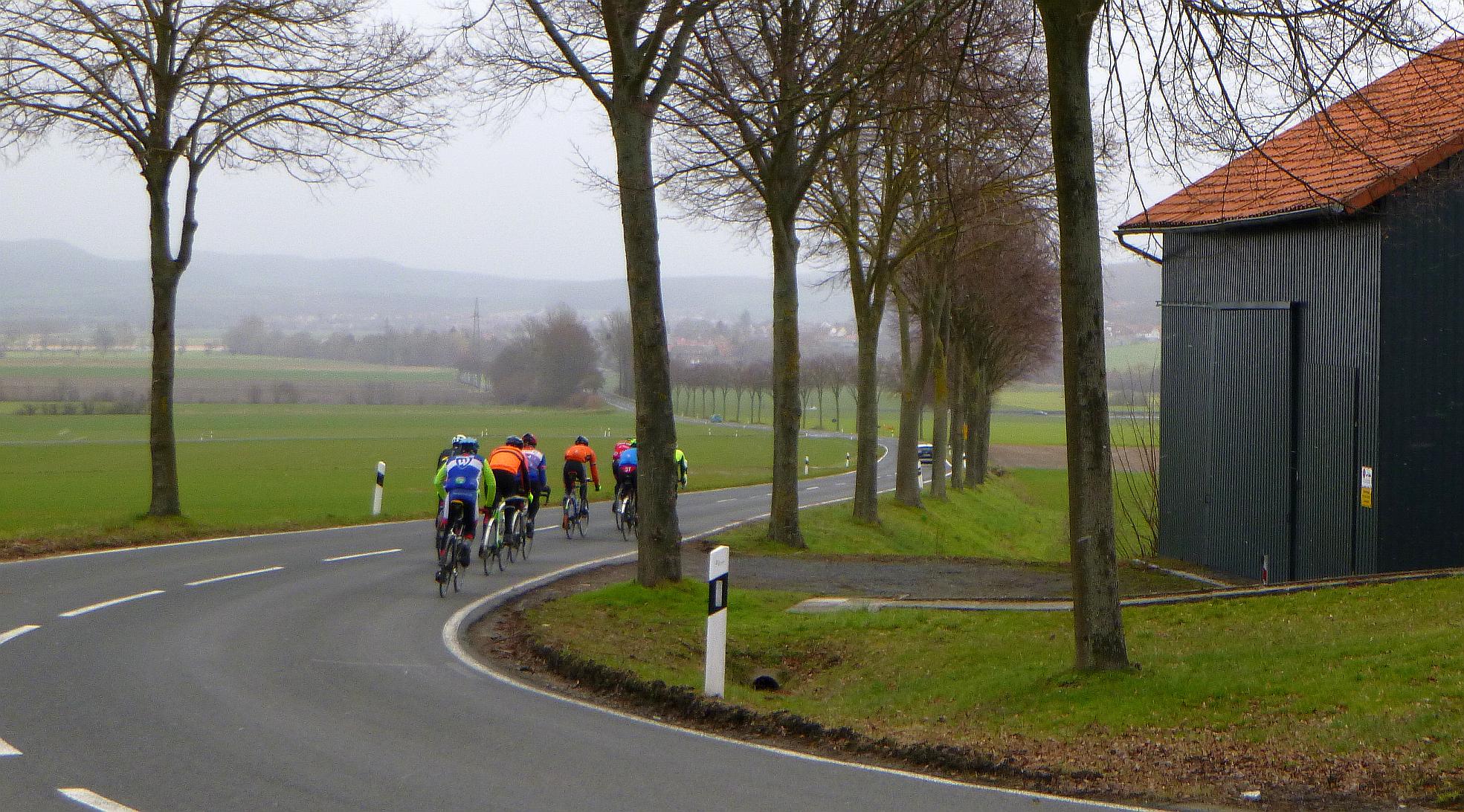Über Rosdorf flach heraus nach Süden war Pflicht, denn der fiese Wind sollte uns bei der Rückfahrt nicht die Laune vermiesen, noch frisch zu Beginn lässt er sich besser niederringen. Das gelang als Gemeinschaft gegen den Wind. An den ansteigenden Wellen nach Volkerode war die Pace freigegeben, um den Unterschieden in Material und Trainingszustand gerecht zu werden. Beim Sammeln haben wir die TUSPO-Wintertrainingsrunde zum ersten Mal getroffen. Wie die Zugvögel, sind auch sie Vorboten des Frühlings – nur nicht heute! Auf den Wellen nach Mariengarten kämpften wir uns in kleinen Gruppen wieder gegen den Südwind, in den sich leichte Flocken mischten. Geschlossen ging es bergab durch Dramfeld zum südlichsten Punkt, Klein Schneen. Die Welle dazwischen war ein Formtest für alle, hier hieß es „all in“, denn danach ging es nur noch bergab mit Rückenwind zurück nach Göttingen. Auch hier zeigte sich, dass ein platter Reifen einen hohen Rollwiderstand hat und, dass das Schnauben nicht nur von der noch nicht so vorhandenen Kondition eines Rockies kommt, den mitgeführten Luftpumpen sei Dank geschuldet – danach rollte es viel leichter!