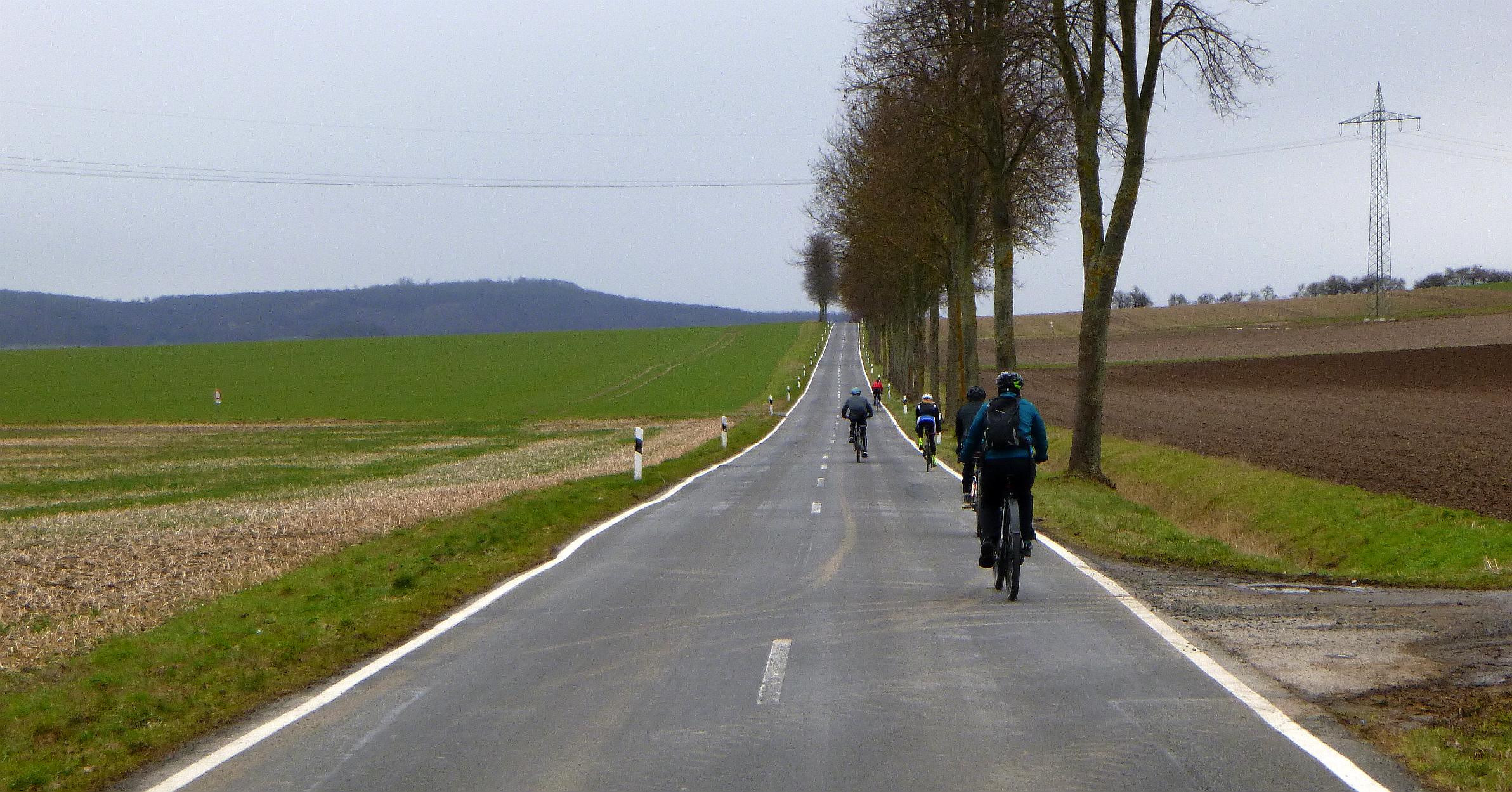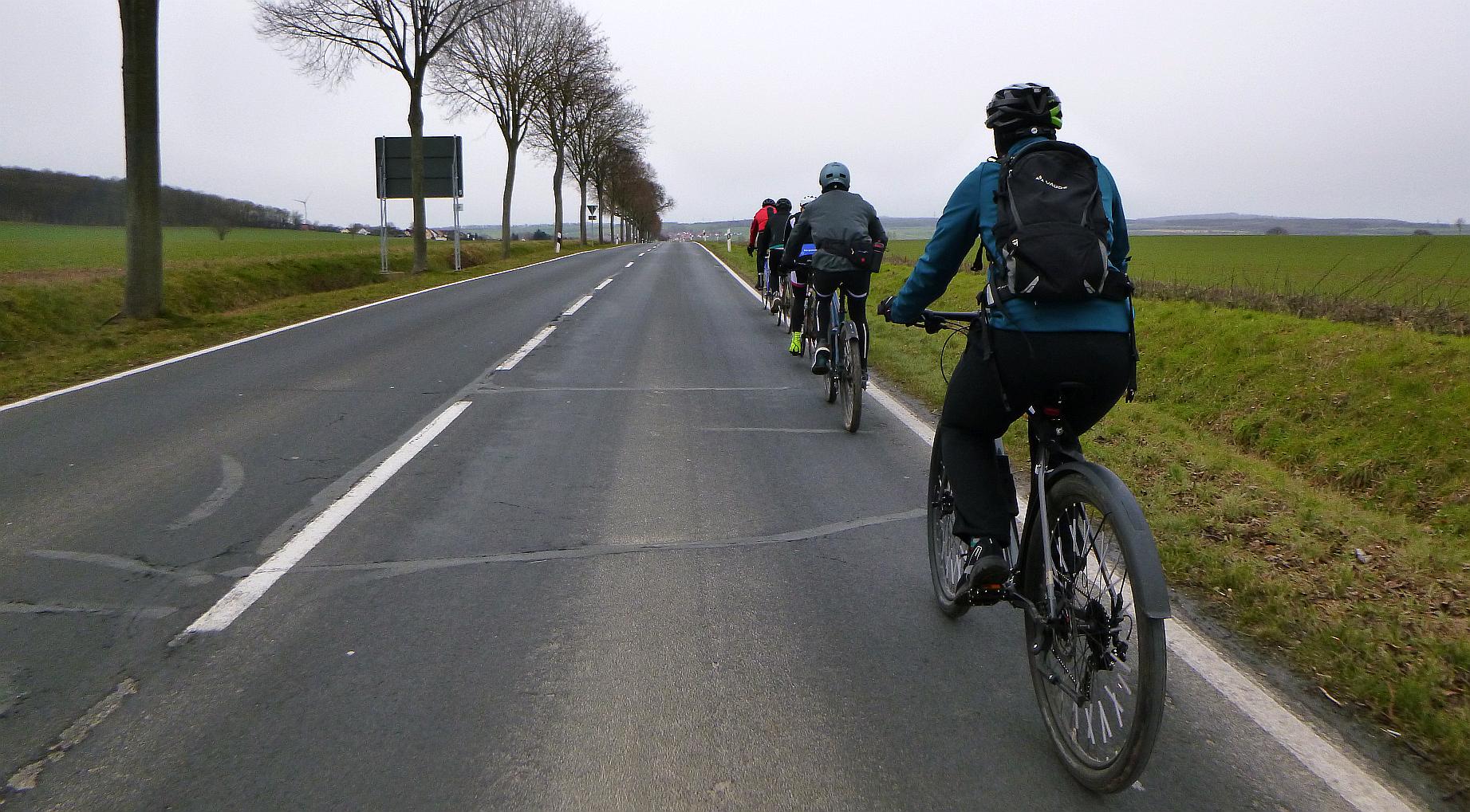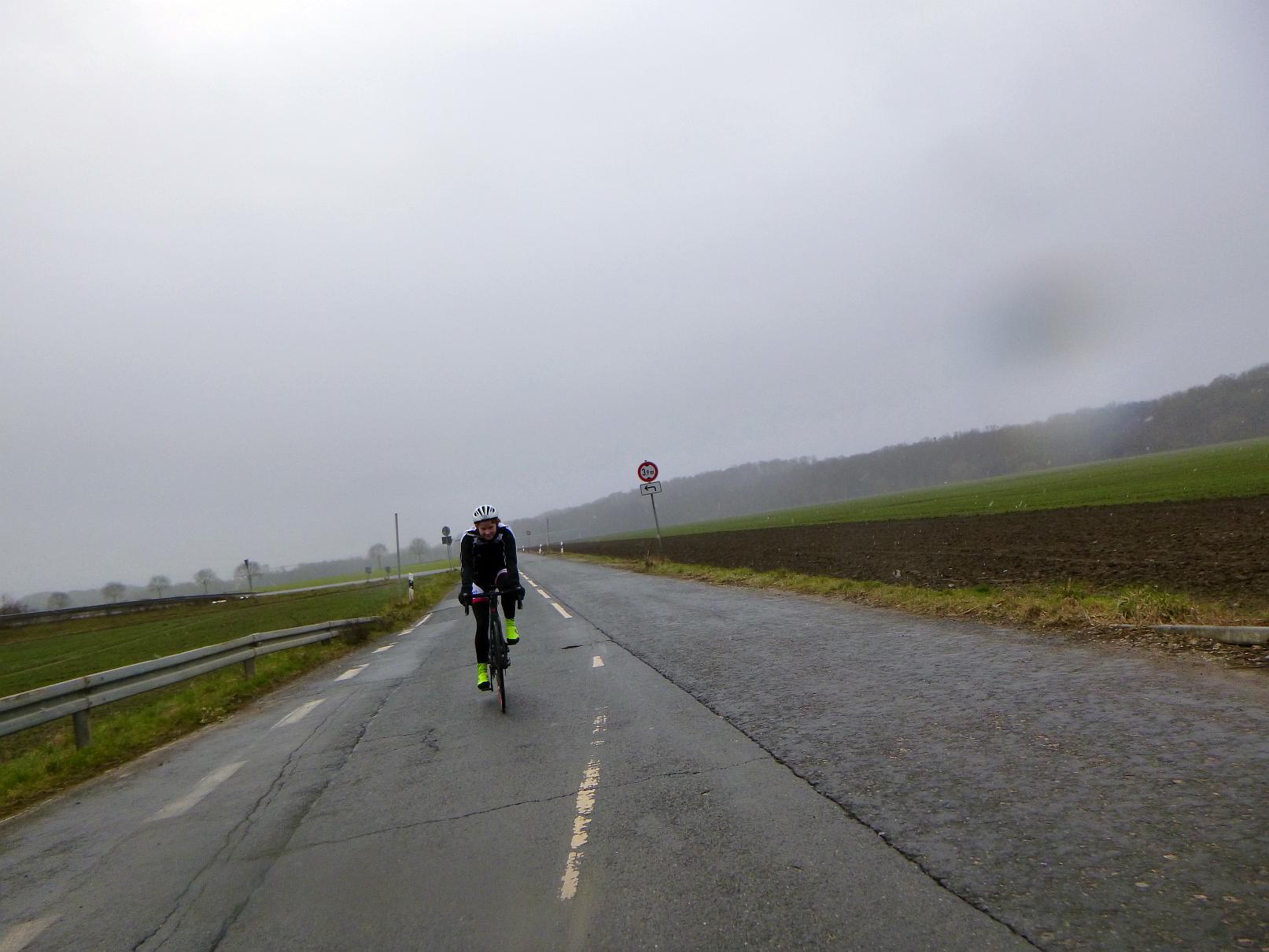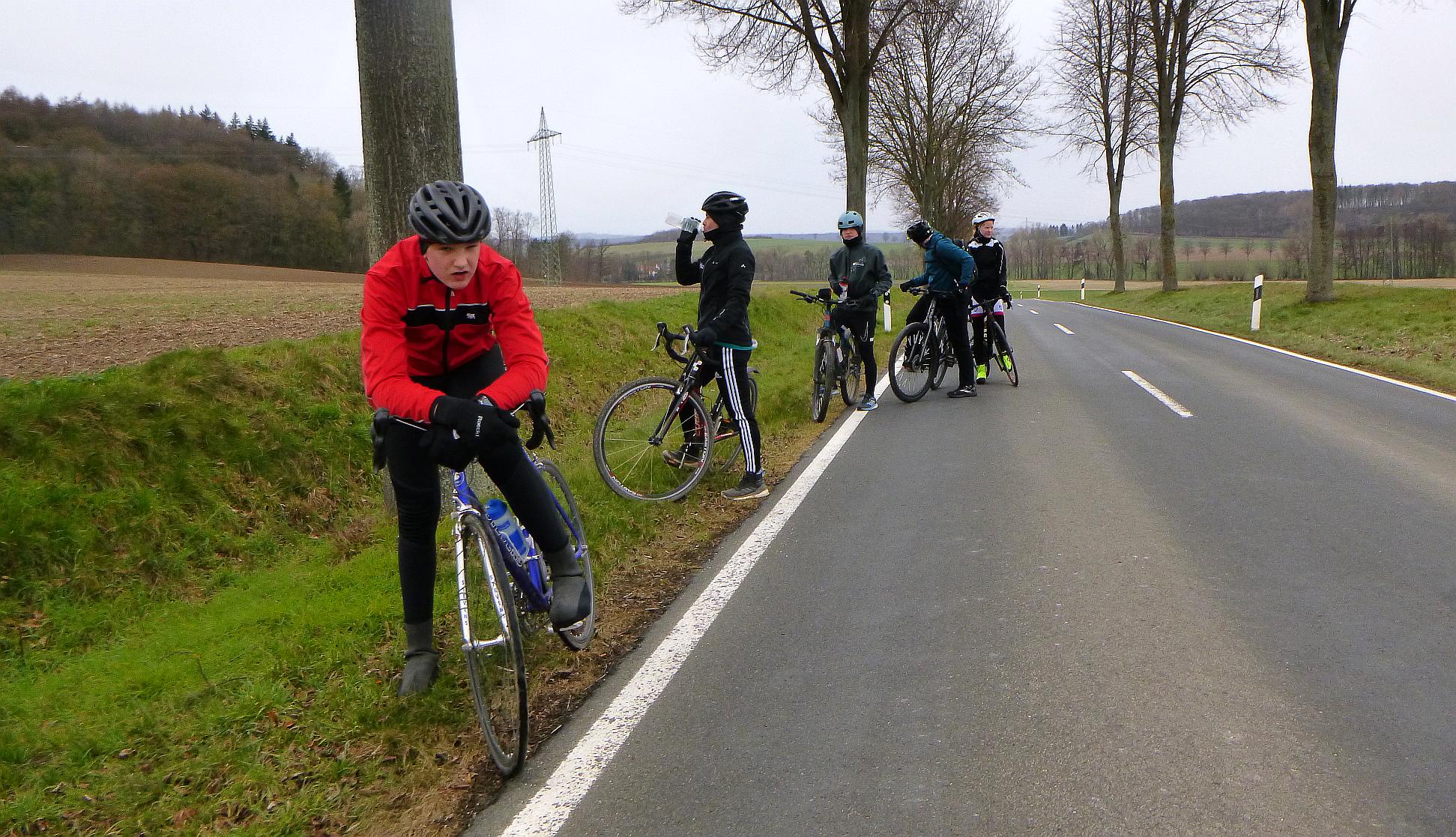 Über Rosdorf flach heraus nach Süden war Pflicht, denn der fiese Wind sollte uns bei der Rückfahrt nicht die Laune vermiesen, noch frisch zu Beginn lässt er sich besser niederringen. Das gelang als Gemeinschaft gegen den Wind. An den ansteigenden Wellen nach Volkerode war die Pace freigegeben, um den Unterschieden in Material und Trainingszustand gerecht zu werden. Beim Sammeln haben wir die TUSPO-Wintertrainingsrunde zum ersten Mal getroffen. Wie die Zugvögel, sind auch sie Vorboten des Frühlings – nur nicht heute! Auf den Wellen nach Mariengarten kämpften wir uns in kleinen Gruppen wieder gegen den Südwind, in den sich leichte Flocken mischten. Geschlossen ging es bergab durch Dramfeld zum südlichsten Punkt, Klein Schneen. Die Welle dazwischen war ein Formtest für alle, hier hieß es „all in“, denn danach ging es nur noch bergab mit Rückenwind zurück nach Göttingen. Auch hier zeigte sich, dass ein platter Reifen einen hohen Rollwiderstand hat und, dass das Schnauben nicht nur von der noch nicht so vorhandenen Kondition eines Rockies kommt, den mitgeführten Luftpumpen sei Dank geschuldet – danach rollte es viel leichter!