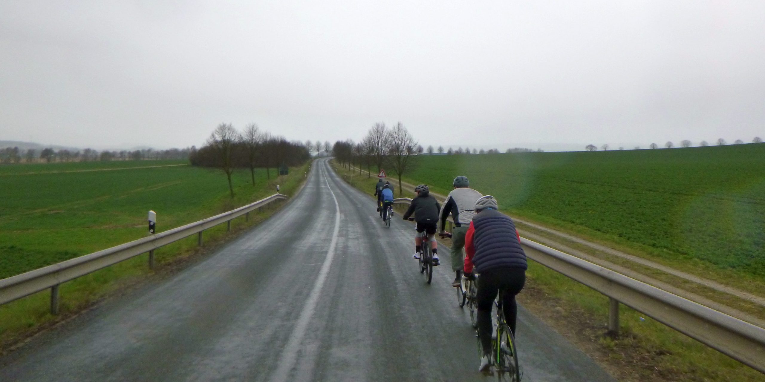 Doch schon bald begann das witterungsbedingte Ausscheidungsfahren in unserer 8er Gruppe auf der 45er Runde, zehrende Bedingungen, falsche, fehlende Klamotten und es blieben nur noch 6. Doch schon kurz vor Mengo (Mengershausen) stieß einer aus der 100er Runde zu uns, da waren wir wieder 7 bei der Einerreihe gegen den Wind! Verstärkung war bitter nötig, denn es war schon zäh bei diesen Bedingungen. Vor dem Einstieg zur“ Rampe von Mengo“ überholten uns zügig die OHG-Trainingsgruppe – Respekt! Im Anstieg bei Gegenwind = Schwerstarbeit zumal bei Kälte, zogen sich die Gruppen ordentlich auseinander, so dass irgendwann gut 30 Schulteammitglieder beider Gruppen vermischt gegen die Steigung arbeiteten!