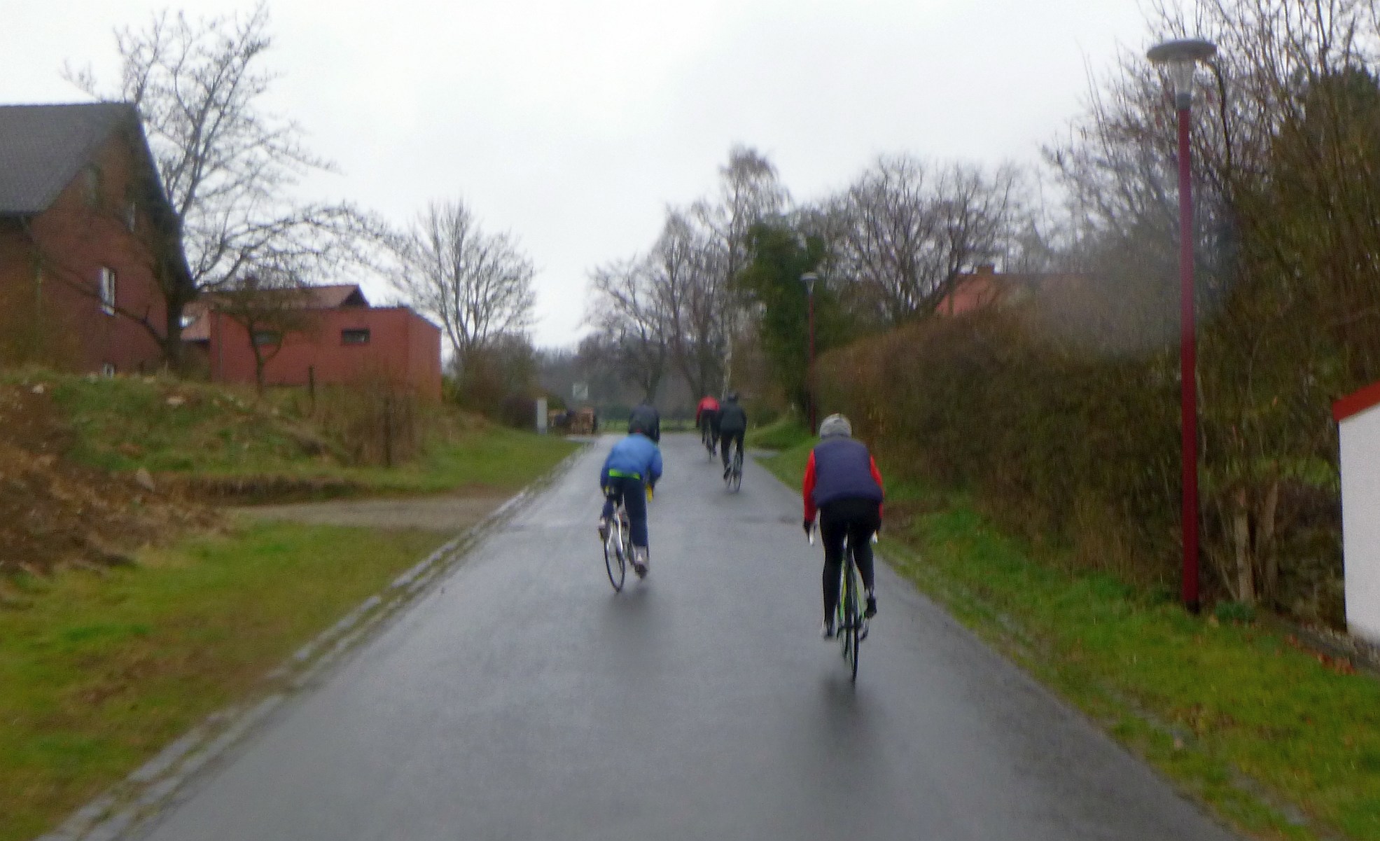 Hier drehten zwei weitere MPG-Team Mitglieder in Erwartung einer eisigen Abfahrt vom Hagen nach Hause ab, da waren es kurzzeitig 5. Doch plötzlich war ein weiteres Mitglied der 100er Runde wieder bei uns! Damit stand die Trainingsgruppe für das Restprogramm, dachten wir 😉 Frohen Mutes nahmen wir gemeinschaftlich trotz Schaltwerksproblemen sogar die kleine, fiese Rampe in Bördel mit; Kommentar: WARUM?!? Von unserem jüngsten Mitglied, der unbedingt im dicksten Gang die Steigung hochfahren wollte: WARUM?!?