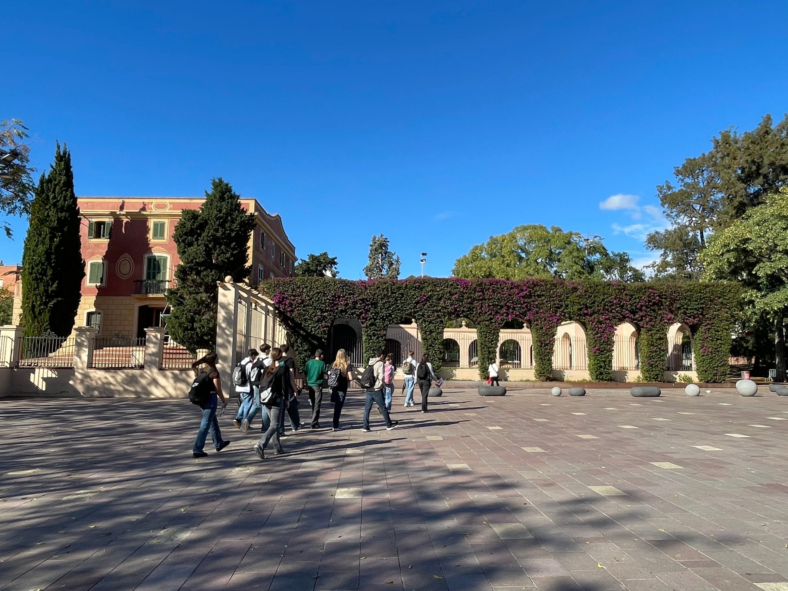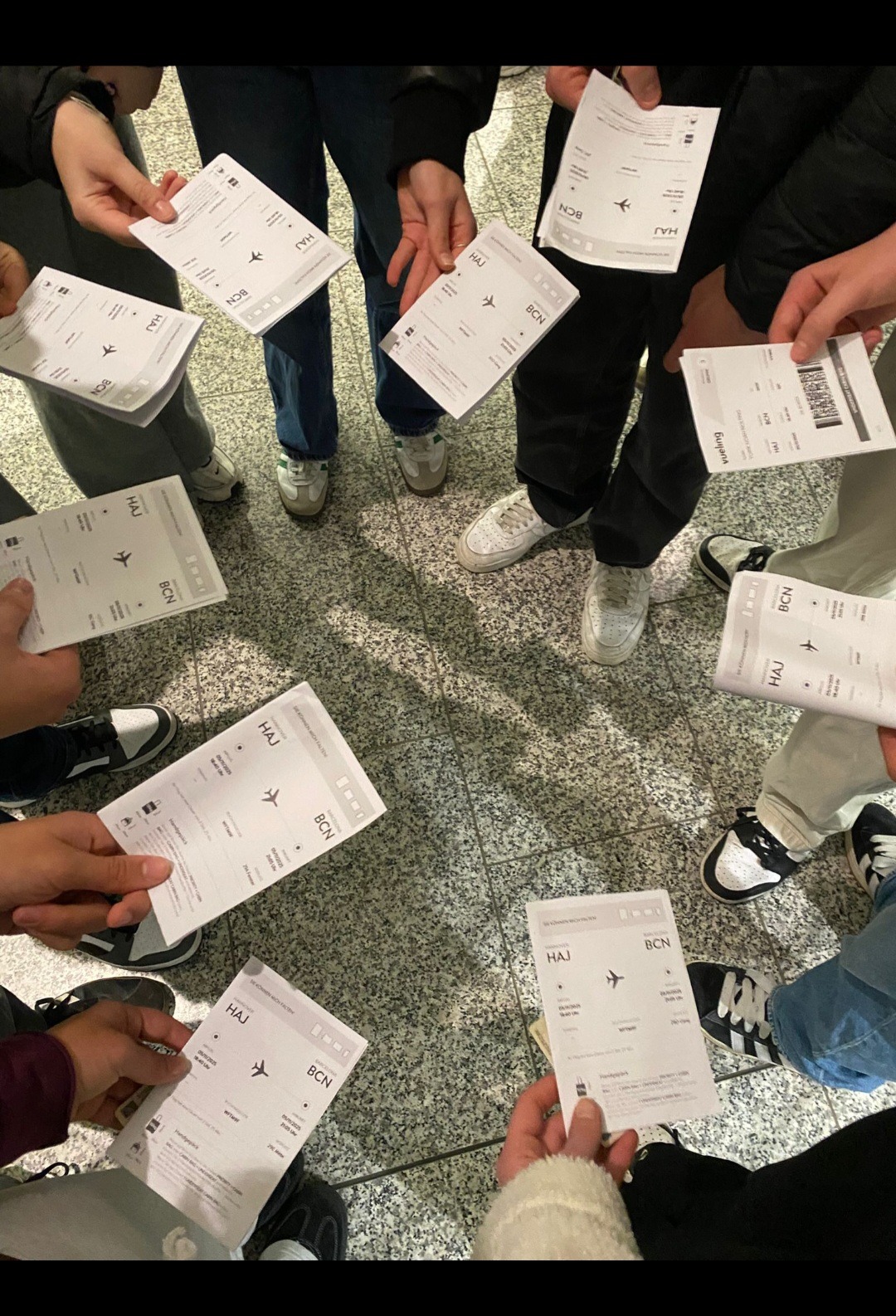Nach ein paar Abschiedstränen ging es am Nachmittag mit dem Zug nach Hannover, um von dort nach Barcelona zu fliegen. Da dies für einige der erste Flug jemals war, war die Nervosität gigantisch und es war ein ganz schöner Trip. Wir waren alle schon sehr aufgeregt und gespannt auf unsere Austauschpartnerinnen und Austauschpartner. Als wir ankamen, begrüßten uns diese mitsamt ihrer Familien ganz erfreut mit einem Plakat und einem Küsschen links und rechts. Zunächst waren alle ein bisschen schüchtern und zurückhaltend. Auf dem Heimweg ging auf unseren Handys ein Notfallalarm wegen eines bevorstehenden Unwetters in Barcelona an – wie aufregend! Wir alle waren gespannt auf das Wetter am nächsten Morgen. Zuhause probierten wir das erste spanische bzw. katalanische Abendessen und wir mussten uns direkt auf Spanisch unterhalten. Ganz schön viel auf einmal! Unsere Gastfamilien haben sich sehr über unsere mitgebrachten Gastgeschenke gefreut. Gegen Mitternacht gingen wir schlafen, porque estábamos muy cansad@s.