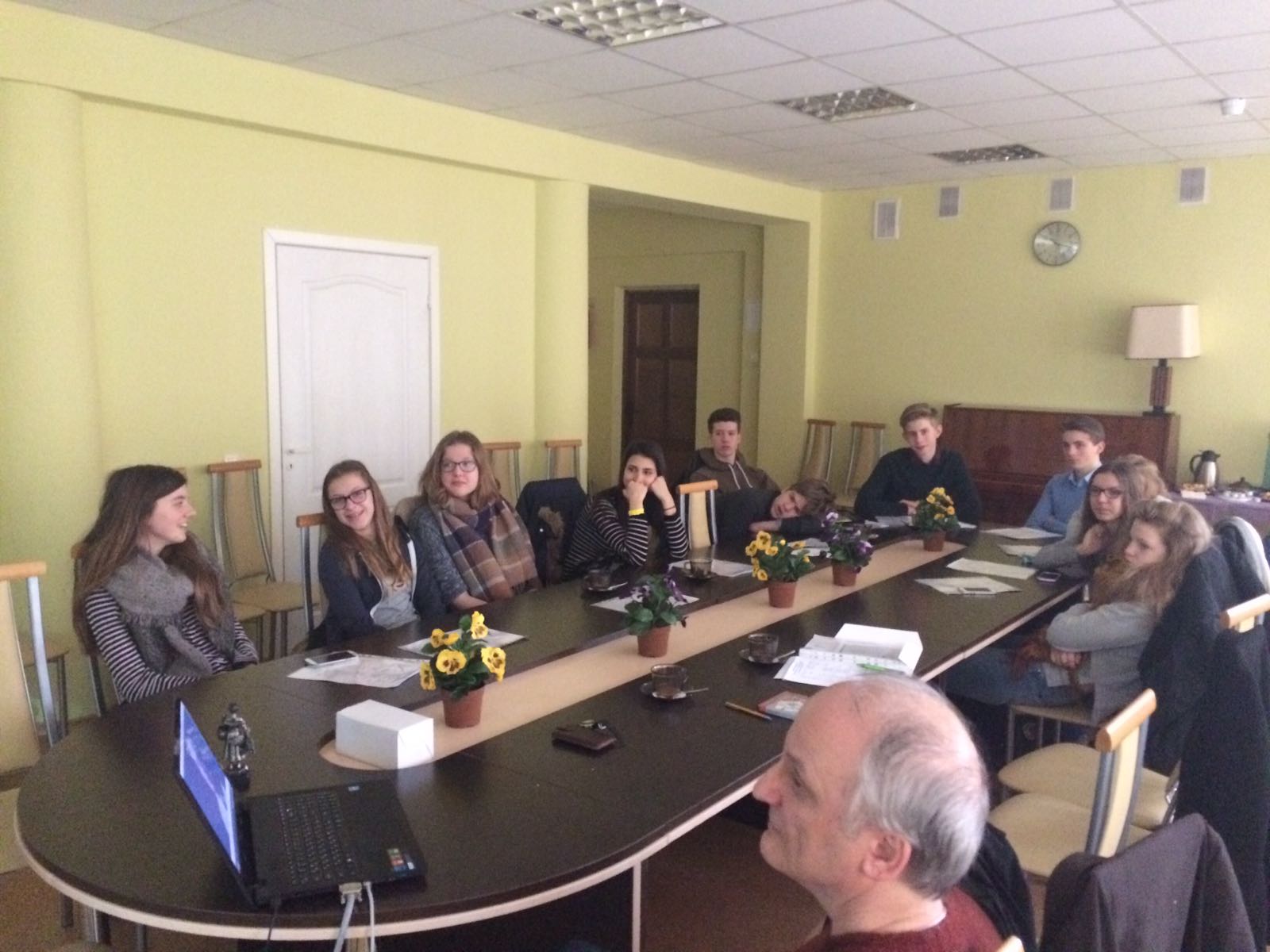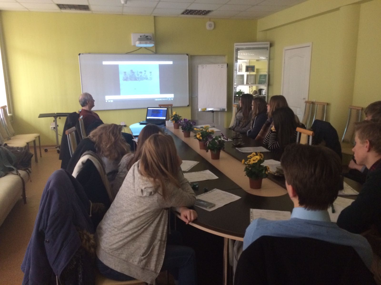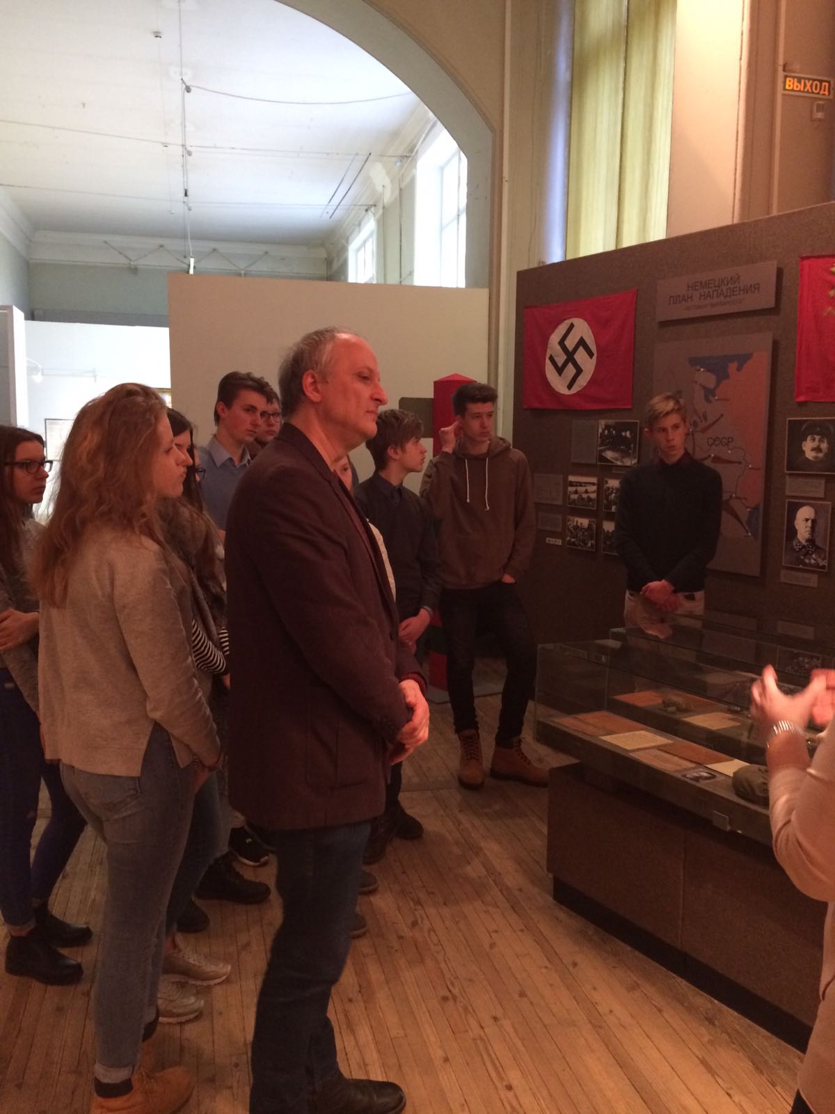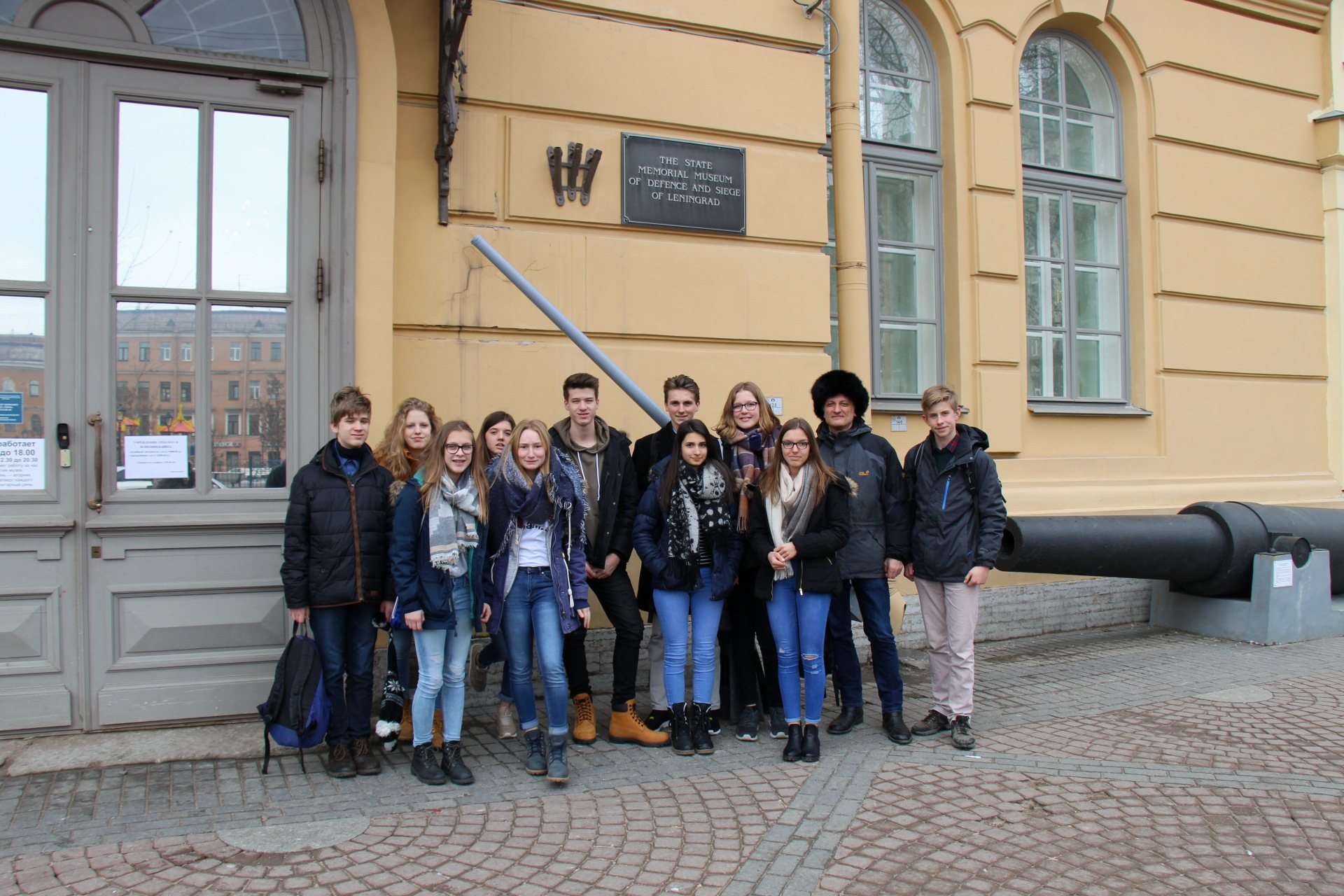 Am Montag, den 13. März, begann der Austausch offiziell um 9 Uhr in der Peterschule. Die stellvertretende Schulleiterin begrüßte uns sehr freundlich und erzählte uns etwas über die deutsch-russischen Verbindungen der Peterschule. Danach schauten wir ein Film über die Leningrader Blockade, die Belagerung der Stadt Petersburg, die in der Sowjetunion Leningrad hieß, durch die Wehrmacht im Jahre 1941-44. Schockierend war für uns die hohe Zahl der Opfer unter der Zivilbevölkerung mit über einer Million Toten durch Hunger oder Luftangriffe.