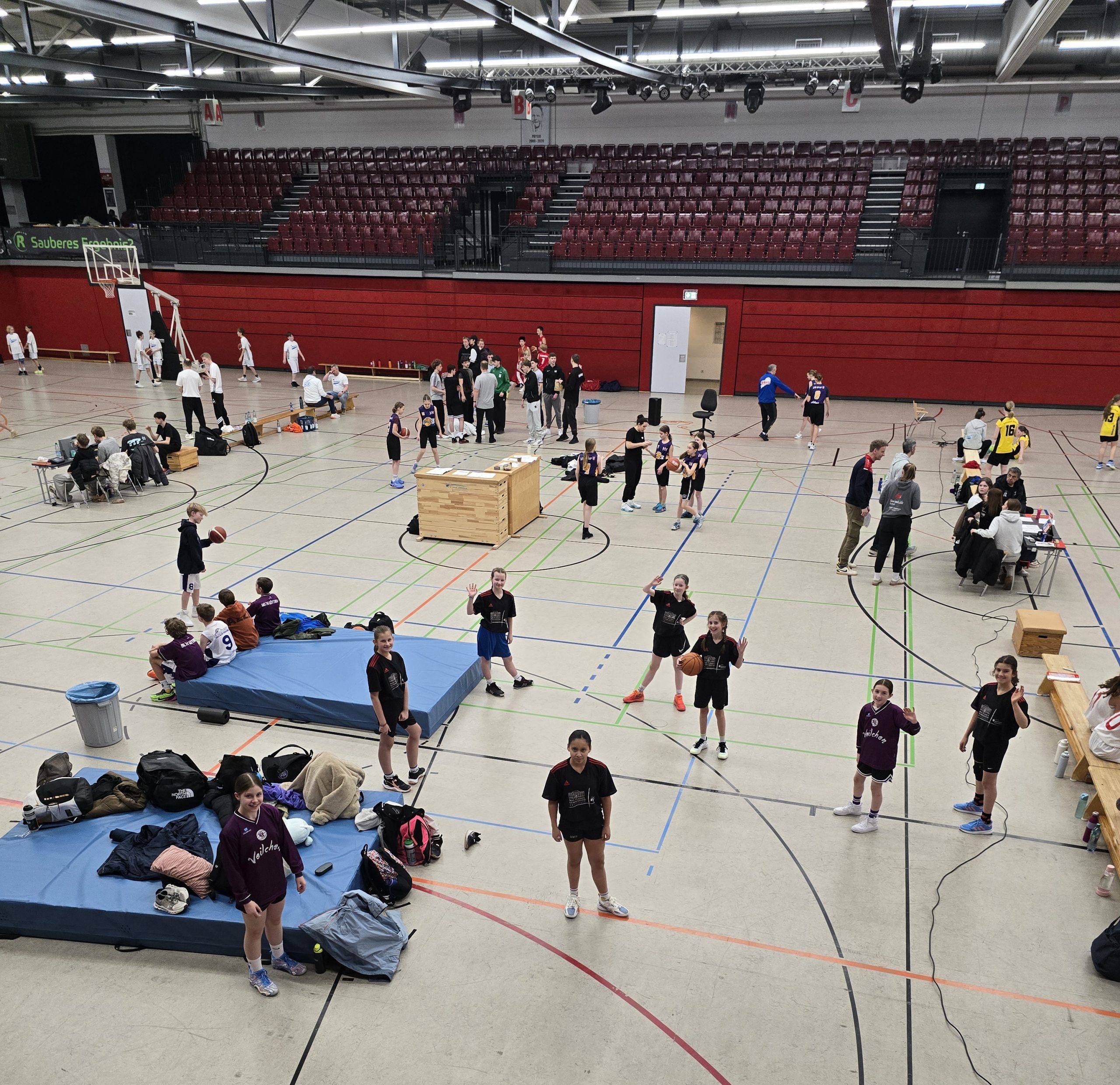 Was für ein Tag für unser U14-Mädchenbasketballteam! Nach einer kleinen Odyssee, die bereits um 4:45 Uhr morgens in Göttingen begann, machten wir uns gemeinsam auf den Weg zur Niedersachsenmeisterschaft nach Quakenbrück. Unterwegs sammelten wir noch Teams vom FKG sowie aus Hannover ein, bevor wir schließlich pünktlich um 9:30 Uhr am Austragungsort ankamen: der beeindruckenden Bundesligahalle der Artland Dragons – Eine großartige Kulisse für einen Landesentscheid.